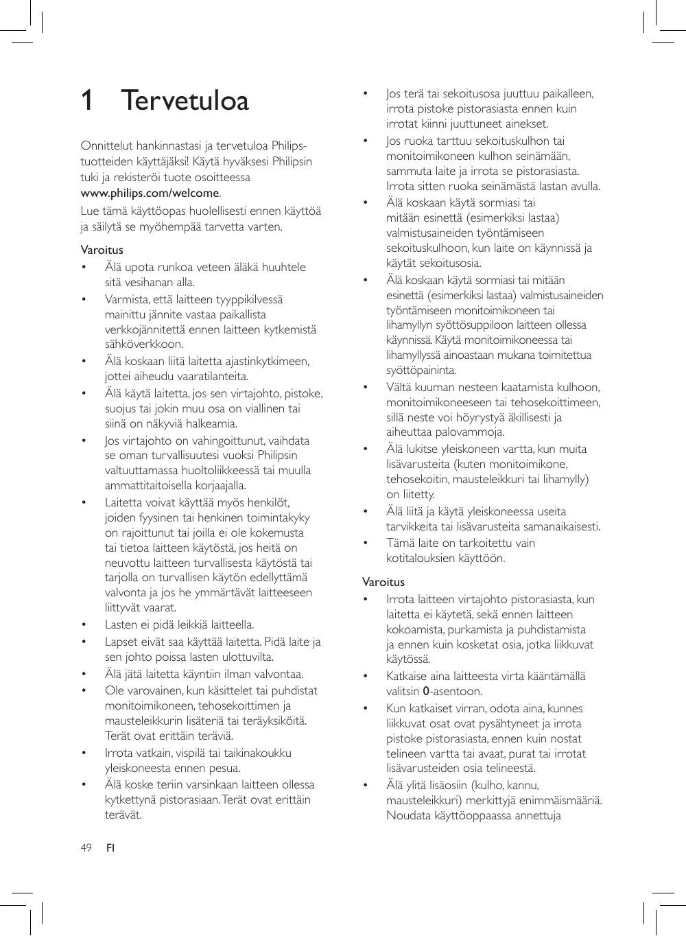 Varoitus • Älä upota runkoa veteen äläkä huuhtele sitä vesihanan alla. • Varmista, että laitteen tyyppikilvessä mainittu jännite vastaa paikallista verkkojännitettä ennen laitteen kytkemistä sähköverkkoon. • Älä koskaan liitä laitetta ajastinkytkimeen, jottei aiheudu vaaratilanteita. • Älä käytä laitetta, jos sen virtajohto, pistoke, suojus tai jokin muu osa on viallinen tai siinä on näkyviä halkeamia. • Jos virtajohto on vahingoittunut, vaihdata se oman turvallisuutesi vuoksi Philipsin valtuuttamassa huoltoliikkeessä tai muulla ammattitaitoisella korjaajalla. • Laitetta voivat käyttää myös henkilöt, joiden fyysinen tai henkinen toimintakyky on rajoittunut tai joilla ei ole kokemusta tai tietoa laitteen käytöstä, jos heitä on neuvottu laitteen turvallisesta käytöstä tai tarjolla on turvallisen käytön edellyttämä valvonta ja jos he ymmärtävät laitteeseen liittyvät vaarat. • Lasten ei pidä leikkiä laitteella. • Lapset eivät saa käyttää laitetta. Pidä laite ja sen johto poissa lasten ulottuvilta. • Älä jätä laitetta käyntiin ilman valvontaa. • Ole varovainen, kun käsittelet tai puhdistat monitoimikoneen, tehosekoittimen ja mausteleikkurin lisäteriä tai teräyksiköitä. Terät ovat erittäin teräviä. • Irrota vatkain, vispilä tai taikinakoukku yleiskoneesta ennen pesua. • Älä koske teriin varsinkaan laitteen ollessa kytkettynä pistorasiaan. Terät ovat erittäin terävät. 49