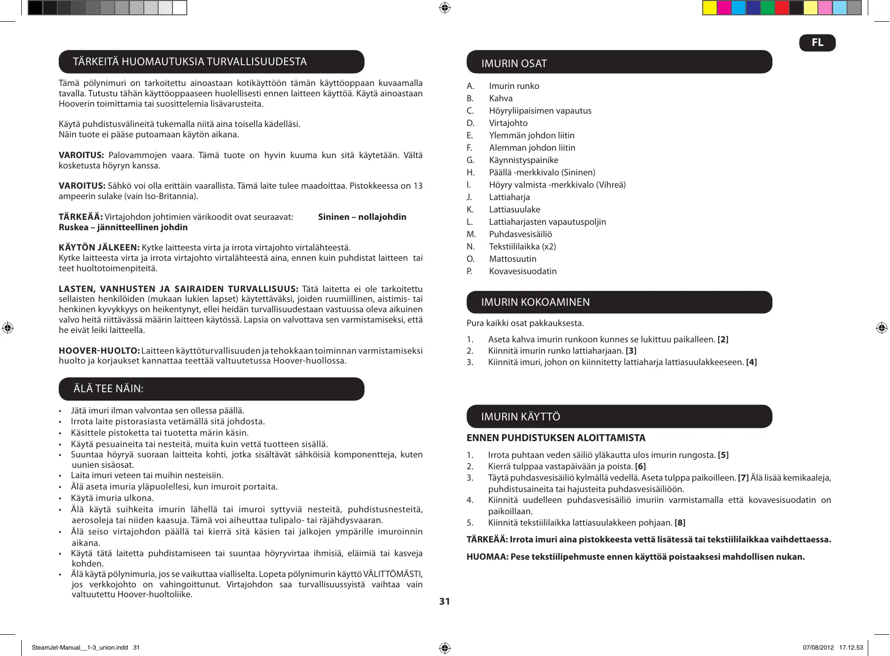 Jätä imuri ilman valvontaa sen ollessa päällä. Irrota laite pistorasiasta vetämällä sitä johdosta. Käsittele pistoketta tai tuotetta märin käsin. Käytä pesuaineita tai nesteitä, muita kuin vettä tuotteen sisällä. Suuntaa höyryä suoraan laitteita kohti, jotka sisältävät sähköisiä komponentteja, kuten uunien sisäosat. Laita imuri veteen tai muihin nesteisiin. Älä aseta imuria yläpuolellesi, kun imuroit portaita. Käytä imuria ulkona. Älä käytä suihkeita imurin lähellä tai imuroi syttyviä nesteitä, puhdistusnesteitä, aerosoleja tai niiden kaasuja. Tämä voi aiheuttaa tulipalo- tai räjähdysvaaran. Älä seiso virtajohdon päällä tai kierrä sitä käsien tai jalkojen ympärille imuroinnin aikana. Käytä tätä laitetta puhdistamiseen tai suuntaa höyryvirtaa ihmisiä, eläimiä tai kasveja kohden. Älä käytä pölynimuria, jos se vaikuttaa vialliselta. Lopeta pölynimurin käyttö VÄLITTÖMÄSTI, jos verkkojohto on vahingoittunut. Virtajohdon saa turvallisuussyistä vaihtaa vain valtuutettu Hoover-huoltoliike. SteamJet-Manual__1-3_union.indd 31