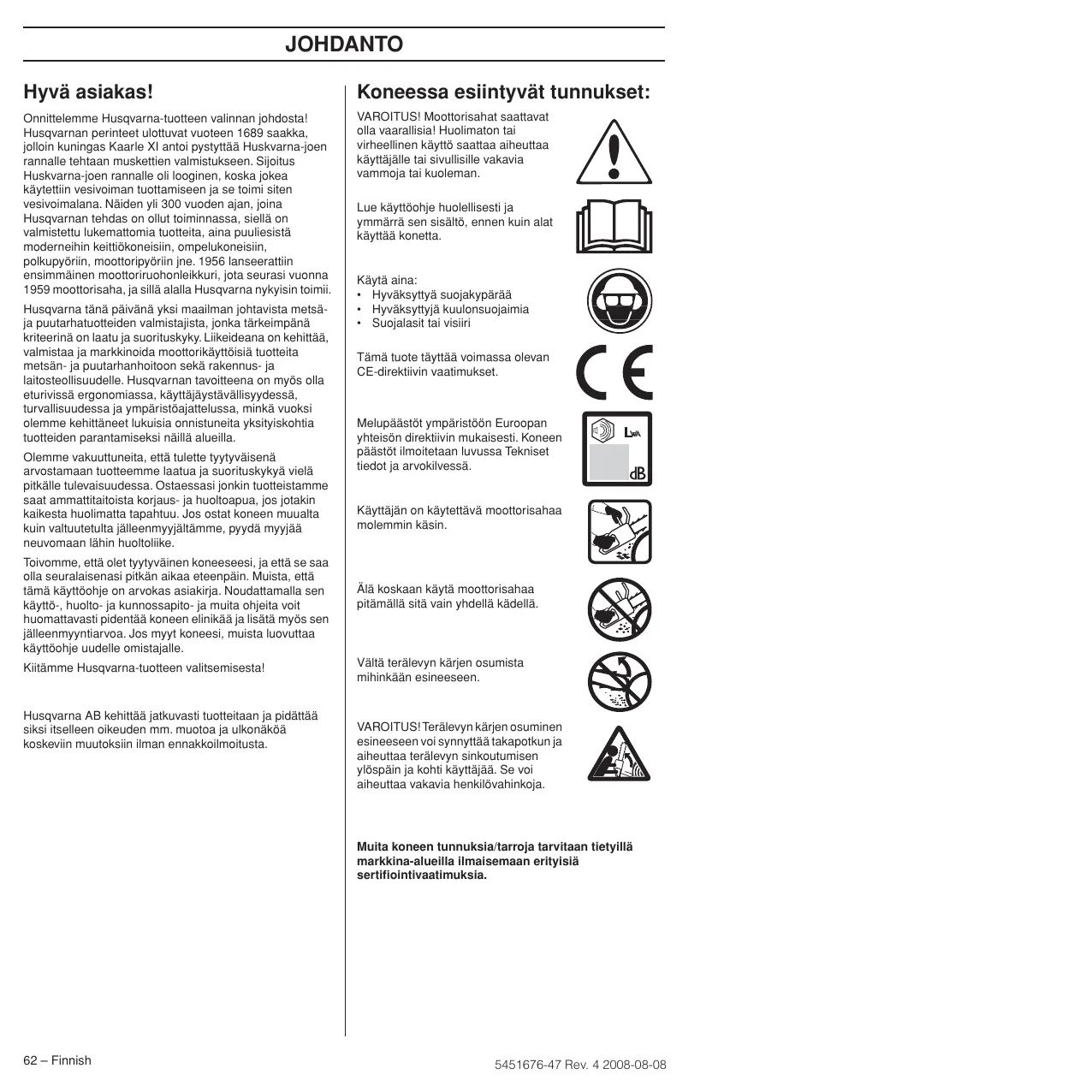 VAROITUS! Koneen alkuperäistä rakennetta ei missään tapauksessa saa muuttaa ilman valmistajan lupaa. Käytä aina alkuperäisiä varaosia. Hyväksymättömien muutosten ja/tai lisävarusteiden käyttö voi aiheuttaa käyttäjälle tai muille vakavia vahinkoja tai kuoleman. VAROITUS! Moottorisaha voi huolimattomasti tai virheellisesti käytettynä olla vaarallinen työväline, joka voi aiheuttaa vakavan tai jopa hengenvaarallisen tapaturman. On erittäin tärkeää, että luet ja ymmärrät tämän käyttöohjeen sisällön. VAROITUS! Äänenvaimennin sisältää kemikaaleja, jotka saattavat olla karsinogeenisiä. Vältä kosketusta näihin osiin, mikäli käsittelet vaurioitunutta äänenvaimenninta. VAROITUS! Moottorin pakokaasujen, ketjuöljysumun ja sahanpurupölyn pitkäaikainen sisäänhengittäminen voi olla terveydelle vaarallista. VAROITUS! Koneen sytytysjärjestelmä tuottaa sähkömagneettisen kentän käynnin aikana. Kenttä saattaa joissakin tapauksissa häiritä sydämentahdistimen toimintaa. Vakavien tai kohtalokkaiden onnettomuuksien ehkäisemiseksi kehotamme sydämentahdistinta käyttäviä henkilöitä neuvottelemaan lääkärin ja tahdistimen valmistajan kanssa ennen koneen käyttämistä.