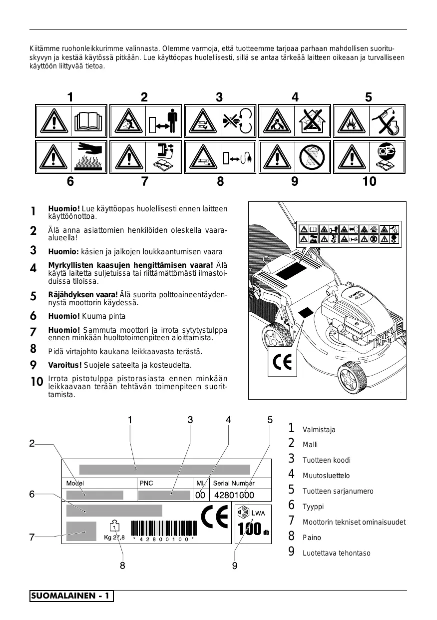 Kiitämme ruohonleikkurimme valinnasta. Olemme varmoja, että tuotteemme tarjoaa parhaan mahdollisen suorituskyvyn ja kestää käytössä pitkään. Lue käyttöopas huolellisesti, sillä se antaa tärkeää laitteen oikeaan ja turvalliseen käyttöön liittyvää tietoa.