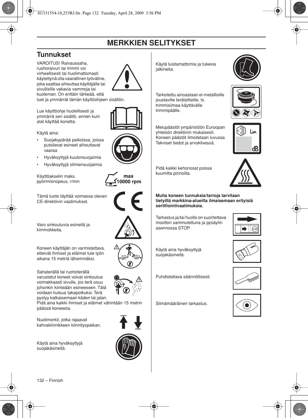H1151554-10,253RJ.fm Page 132 Tuesday, April 28, 2009 3:56 PM MERKKIEN SELITYKSET Tunnukset VAROITUS! Raivaussaha, ruohoraivuri tai trimmi voi virheellisesti tai huolimattomasti käytettynä olla vaarallinen työväline, joka saattaa aiheuttaa käyttäjälle tai sivullisille vakavia vammoja tai kuoleman. On erittäin tärkeää, että luet ja ymmärrät tämän käyttöohjeen sisällön.