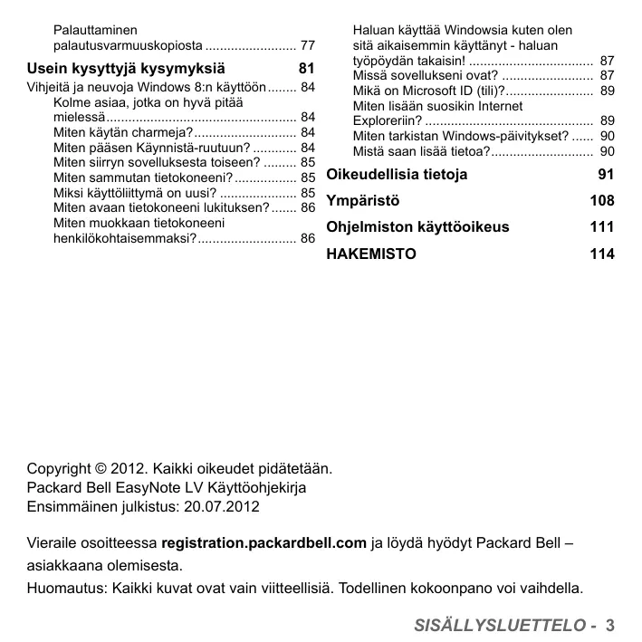 käytössä silloin, kun se on tallennettu palvelimeen vain ja ainoastaan sen jakamista muihin tietokoneisiin varten. Jos OHJELMISTOTUOTTEEN käyttäjien odotettavissa oleva määrä ylittää asiakkaalle myönnettyjen käyttöoikeuksien määrän, käytössä on oltava järjestelmä, joka varmistaa, että OHJELMISTOTUOTETTA samanaikaisesti käyttävien käyttäjien määrä ei ylitä myönnettyjen käyttöoikeuksien määrää. Jos OHJELMISTOTUOTE on asennettu pysyvästi tietokoneen kiintolevylle tai muulle tallennusvälineelle (verkkopalvelinta lukuun ottamatta) ja yksi henkilö käyttää kyseistä tietokonetta yli 80 prosenttia sen koko käyttöajasta, tämä henkilö saa käyttää OHJELMISTOTUOTETTA myös kannettavassa tietokoneessaan tai kotitietokoneessaan. 2. Copyright Tämä OHJELMISTO on Packard Bell tai sen toimittajien omaisuutta. OHJELMISTO on suojattu tekijänoikeuslailla ja kansainvälisillä sopimusmääräyksillä Yhdysvalloissa ja muissa maissa. Tämän johdosta OHJELMISTOA tulee kohdella samoin kuin mitä tahansa muuta tekijänoikeudella suojattua aineistoa (esimerkiksi kirjaa tai musiikkitallennetta), paitsi että asiakas saa joko tallentaa OHJELMISTON CD- ja/tai DVD-levyllä toimitetun osan (jos on) yhdelle kiintolevylle sillä edellytyksellä, että alkuperäinen versio säilytetään ainoastaan arkistointia ja varmuuskopiointia varten. OHJELMISTON CD- ja/tai DVDlevyillä toimitetun osien ja OHJELMISTON mukana toimitetun kirjallisen materiaalin osittainenkin kopioiminen on kielletty. 3. Muut rajoitukset Asiakas ei saa vuokrata tai lainata OHJELMISTOTUOTETTA, mutta asiakas saa siirtää OHJELMISTOTUOTTEEN ja sen mukana toimitetun kirjallisen materiaalin pysyvästi toiselle henkilölle sillä edellytyksellä, että OHJELMISTOTUOTTEESTA ei säilytetä kopioita ja että siirron vastaanottaja hyväksyy käyttöoikeussopimuksen ehdot. OHJELMISTOTUOTTEEN valmistustapaa ei saa perusteellisesti tutkia eikä sitä saa purkaa tai hajottaa. Jos OHJELMISTOTUOTE siirretään, sen mukana on siirrettävä myös uusin päivitys ja kaikki sitä edeltävät versiot.