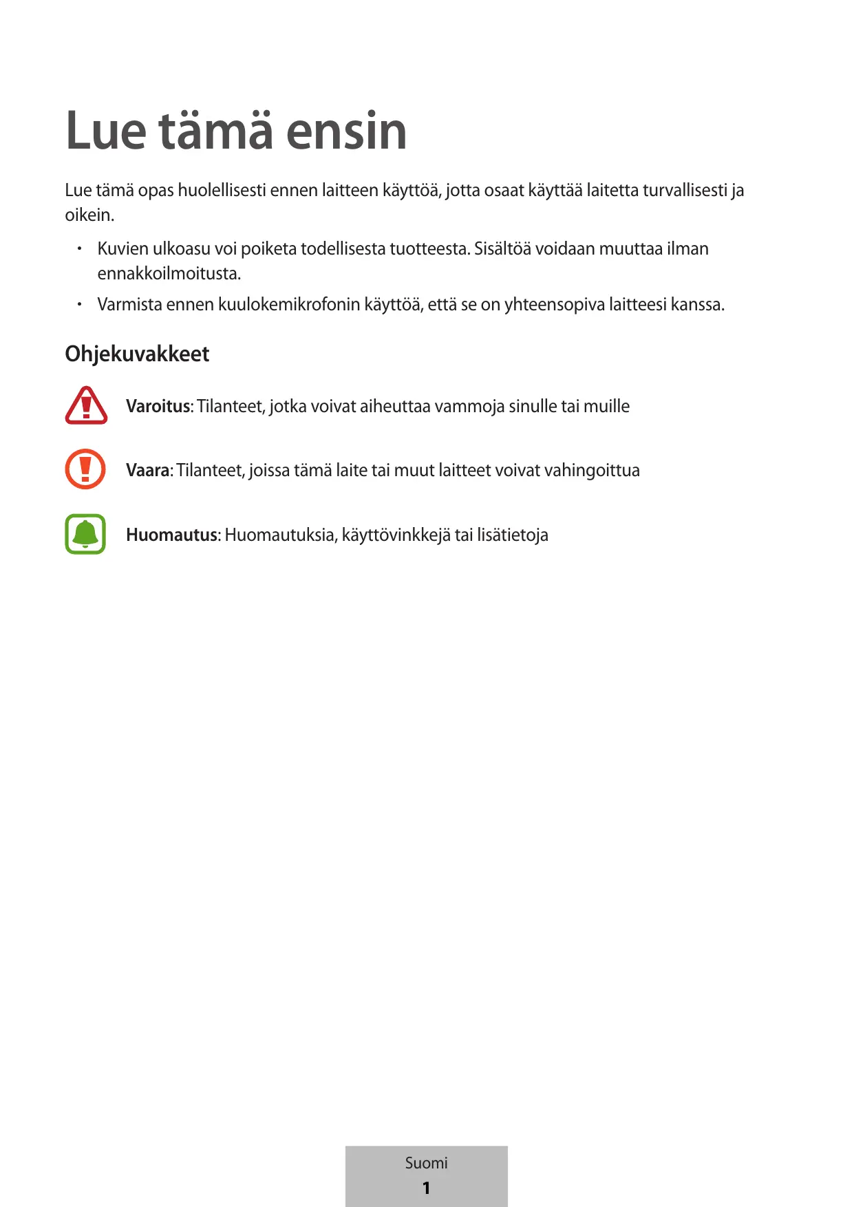 - Varmista ennen kuulokemikrofonin käyttöä, että se on yhteensopiva laitteesi kanssa. Ohjekuvakkeet Varoitus: Tilanteet, jotka voivat aiheuttaa vammoja sinulle tai muille Vaara: Tilanteet, joissa tämä laite tai muut laitteet voivat vahingoittua Huomautus: Huomautuksia, käyttövinkkejä tai lisätietoja Suomi