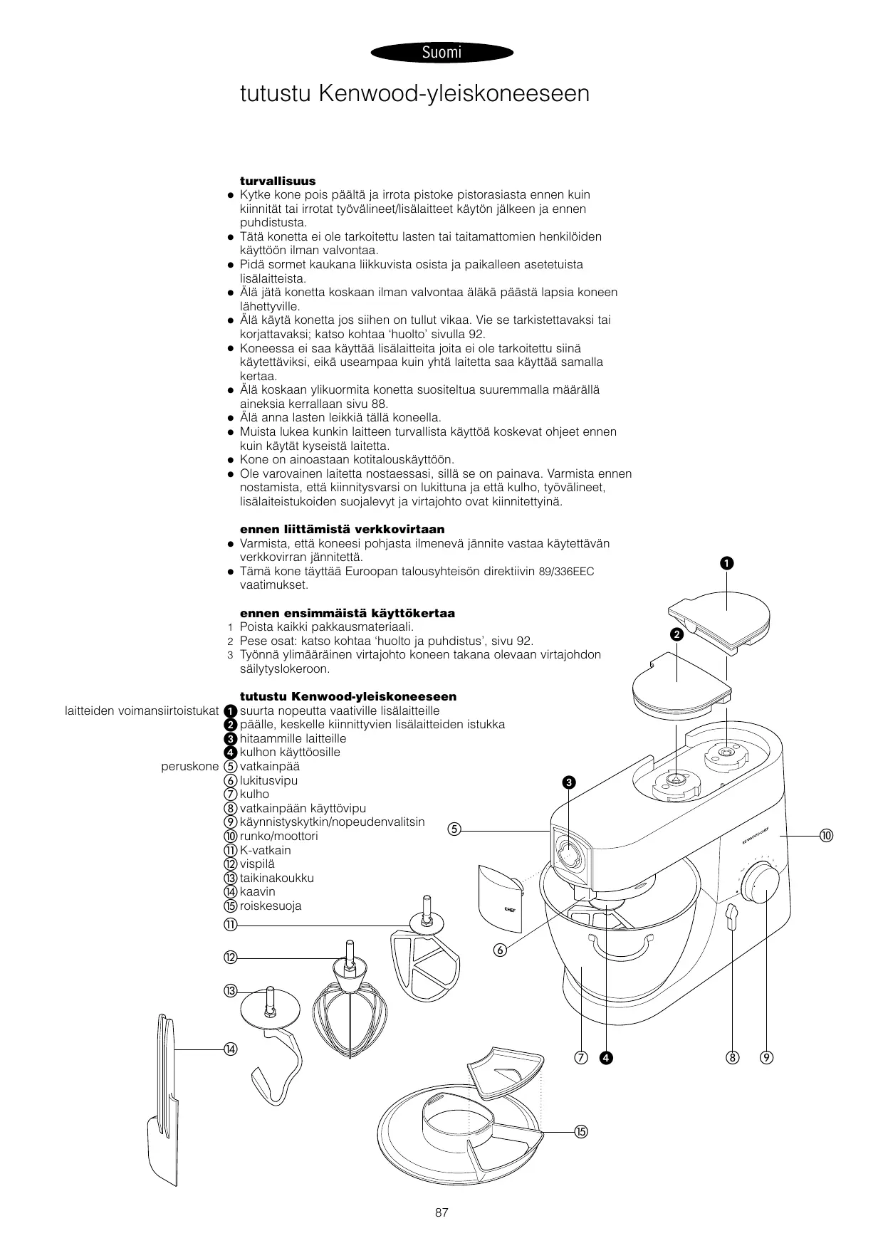 tutustu Kenwood-yleiskoneeseen Kytke kone pois päältä ja irrota pistoke pistorasiasta ennen kuin kiinnität tai irrotat tyôvälineet/lisälaitteet käytôn jälkeen ja ennen puhdistusta. Tätä konetta ei ole tarkoitettu lasten tai taitamattomien henkilôiden käyttéôn ilman valvontaa. Pidä sormet kaukana liikkuvista osista ja paikalleen asetetuista lisälaitteista. Âlà jätä konetta koskaan ilman valvontaa äläkä pästä lapsia koneen lähettyville Àlä käytä konetta jos siihen on tullut vikaa. Vie se tarkistettavaksi tai korjattavaksi; katso kohtaa ‘huolto' sivulla 92. Koneessa ei saa käyttää lisälaitteita joita ei ole tarkoitettu sinä käytettäviksi, eikä useampaa kuin yhté laitetta saa käyttää samalla kertaa. Àlä koskaan ylkuormita konetta suositeltua suuremmalla määrällà aineksia kerrallaan sivu 88 là anna lasten leikkiä tällä koneella. Muista lukea kunkin laitteen turvallista käyttôä koskevat ohjeet ennen kuin käytät kyseistä laitetta: Kone on ainoastaan kotitalouskäyttéôn. Ole varovainen laitetta nostaessasi, sillä se on painava. Varmista ennen nostamista, että kinnitysvarsi on lukittuna ja että kulho, tyôvälineet, lisälaiteistukoiden suojalevyt ja virtajohto ovat kinnitettyinä. ennen liüttämistä verkkovirtaan Varmista, että koneesi pohjasta ilmenevä jännite vastaa käytettävän verkkovirran jännitettä. Tämä kone täyttää Euroopan talousyhteisôn direktiivin 89/336EEC vaatimukset. ennen ensimmäistä käyttôkertaa Poista kaikki pakkausmateriaali. Pese osat: katso kohtaa ‘huolto ja puhdistus’, sivu 92 Tyônnä vlimääräinen virtajohto koneen takana olevaan virtajohdon säilytyslokeroon: CRE tutustu Kenwood-yleiskoneeseen laitteiden voimansiirtoistukat @ suurta nopeutta vaativille lisälaitteille péälle, keskelle kinnittyvien lislaitteiden istukka hitaammille laitteille kulhon käyttéosille peruskone (5) vatkainpää (6) lukitusvipu @kulho () vatkainpään käyttôvipu (@)käynnistyskytkin/nopeudenvalitsin @D runko/moottori K-vatkain vispilà (D taikinakoukku (&) kaavin @ roiskesuoja