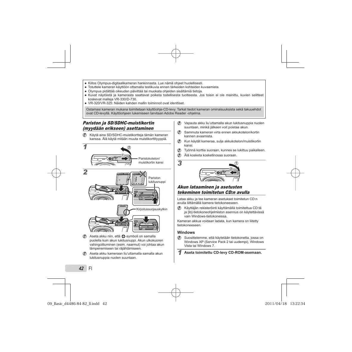 Téléchargez la notice de votre Digitaalinen kamera au format PDF gratuitement ! Retrouvez votre notice VR-325 - OLYMPUS et reprennez votre appareil électronique en main. Sur cette page sont publiés tous les documents nécessaires à l'utilisation de votre appareil VR-325 de la marque OLYMPUS.