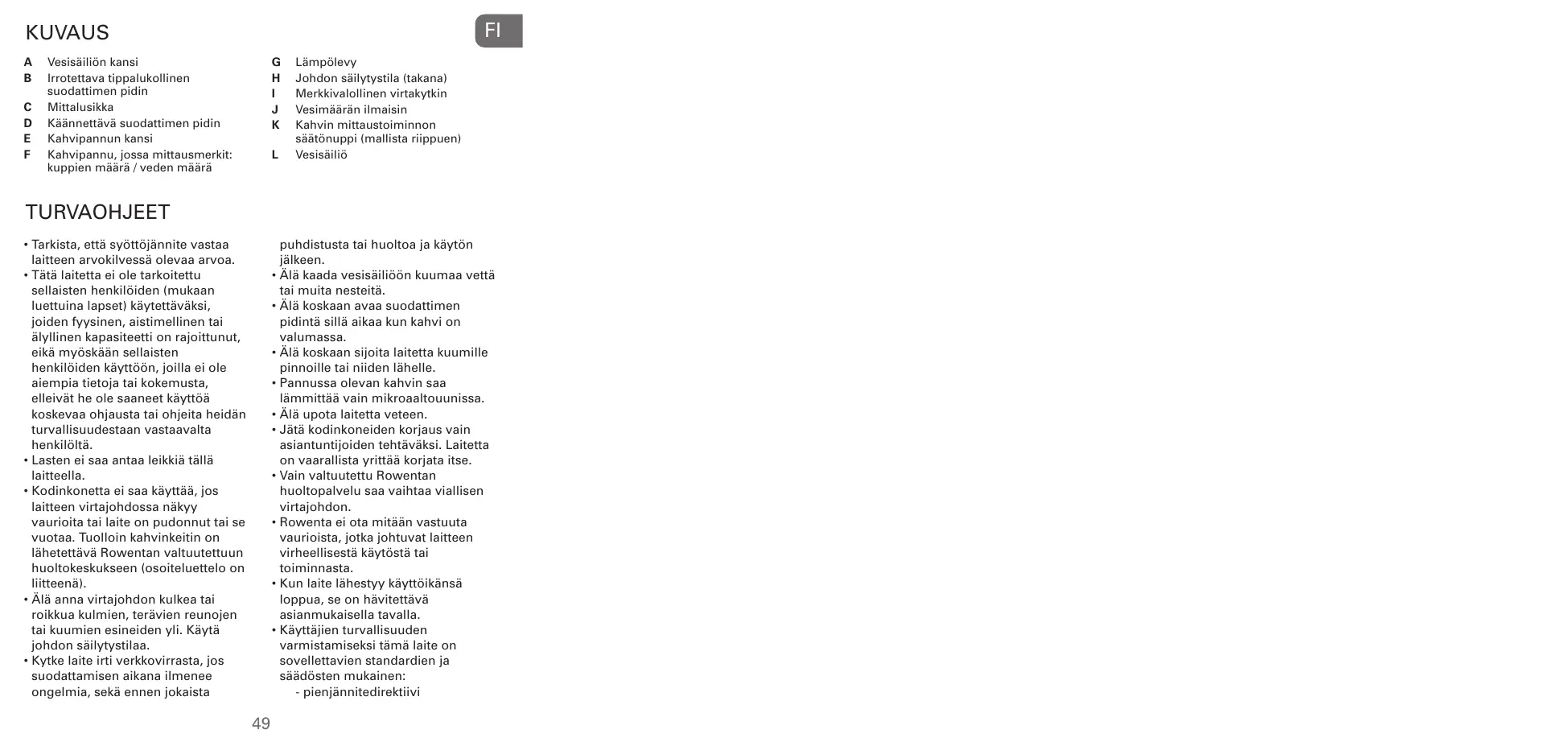 TURVAOHJEET puhdistusta tai huoltoa ja käytön jälkeen. • Älä kaada vesisäiliöön kuumaa vettä tai muita nesteitä. • Älä koskaan avaa suodattimen pidintä sillä aikaa kun kahvi on valumassa. • Älä koskaan sijoita laitetta kuumille pinnoille tai niiden lähelle. • Pannussa olevan kahvin saa lämmittää vain mikroaaltouunissa. • Älä upota laitetta veteen. • Jätä kodinkoneiden korjaus vain asiantuntijoiden tehtäväksi. Laitetta on vaarallista yrittää korjata itse. • Vain valtuutettu Rowentan huoltopalvelu saa vaihtaa viallisen virtajohdon. • Rowenta ei ota mitään vastuuta vaurioista, jotka johtuvat laitteen virheellisestä käytöstä tai toiminnasta. • Kun laite lähestyy käyttöikänsä loppua, se on hävitettävä asianmukaisella tavalla. • Käyttäjien turvallisuuden varmistamiseksi tämä laite on sovellettavien standardien ja säädösten mukainen: - pienjännitedirektiivi