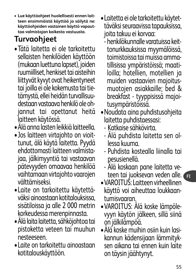 •Laitetta ei ole tarkoitettu käytettäväksi seuraavissa tapauksissa, joita takuu ei korvaa: - henkilökunnalle varatuissa keittonurkkauksissa myymälöissä, toimistoissa tai muissa ammatillisissa ympäristöissä; maatiloilla; hotellien, motellien ja muiden vastaavien majoitusmuotojen asiakkaille; bed & breakfast - tyyppisissä majoitusympäristöissä. •Noudata aina puhdistusohjeita laitetta puhdistaessasi: - Katkaise sähkövirta. - Älä puhdista laitetta sen ollessa kuuma. - Puhdista kostealla liinalla tai pesusienellä. - Älä koskaan pane laitetta veteen tai juoksevan veden alle. •VAROITUS: Laitteen virheellinen käyttö voi aiheuttaa loukkaantumisvaaran. •VAROITUS: Älä koske lämpölevyyn käytön jälkeen, sillä siinä on jälkilämpöä. •Älä koske muihin osiin kuin lasikannun kädensijaan lämmityksen aikana tai ennen kuin laite on täysin jäähtynyt. 55