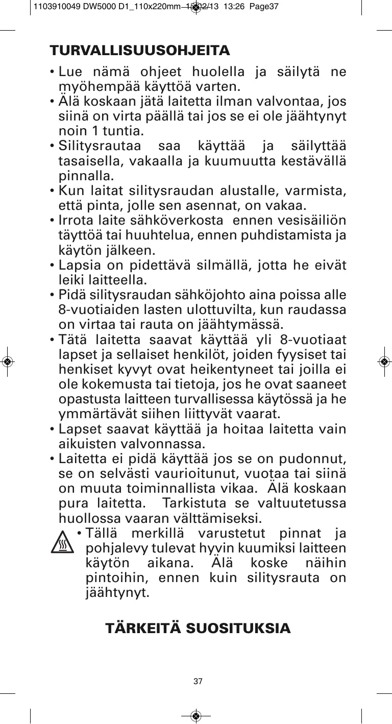 À Tällà merkillä varustetut pinnat ja pohjalevy tulevat hyvin kuumiksi laitteen käytôn aikana. Alä koske näihin pintoihin, ennen kuin silitysrauta on jäähtynyt.
