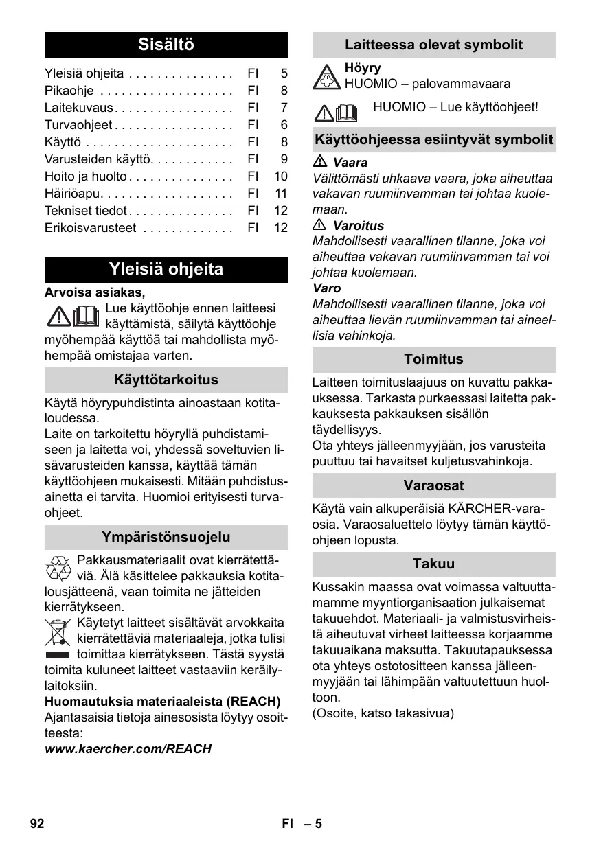 Yleisiä ohjeita Arvoisa asiakas, Lue käyttöohje ennen laitteesi käyttämistä, säilytä käyttöohje myöhempää käyttöä tai mahdollista myöhempää omistajaa varten. HUOMIO – Lue käyttöohjeet! Käyttöohjeessa esiintyvät symbolit Vaara Välittömästi uhkaava vaara, joka aiheuttaa vakavan ruumiinvamman tai johtaa kuolemaan. 몇 Varoitus Mahdollisesti vaarallinen tilanne, joka voi aiheuttaa vakavan ruumiinvamman tai voi johtaa kuolemaan. Varo Mahdollisesti vaarallinen tilanne, joka voi aiheuttaa lievän ruumiinvamman tai aineellisia vahinkoja. Toimitus Käyttötarkoitus Käytä höyrypuhdistinta ainoastaan kotitaloudessa. Laite on tarkoitettu höyryllä puhdistamiseen ja laitetta voi, yhdessä soveltuvien lisävarusteiden kanssa, käyttää tämän käyttöohjeen mukaisesti. Mitään puhdistusainetta ei tarvita. Huomioi erityisesti turvaohjeet. Ympäristönsuojelu Pakkausmateriaalit ovat kierrätettäviä. Älä käsittelee pakkauksia kotitalousjätteenä, vaan toimita ne jätteiden kierrätykseen. Käytetyt laitteet sisältävät arvokkaita kierrätettäviä materiaaleja, jotka tulisi toimittaa kierrätykseen. Tästä syystä toimita kuluneet laitteet vastaaviin keräilylaitoksiin. Huomautuksia materiaaleista (REACH) Ajantasaisia tietoja ainesosista löytyy osoitteesta: www.kaercher.com/REACH