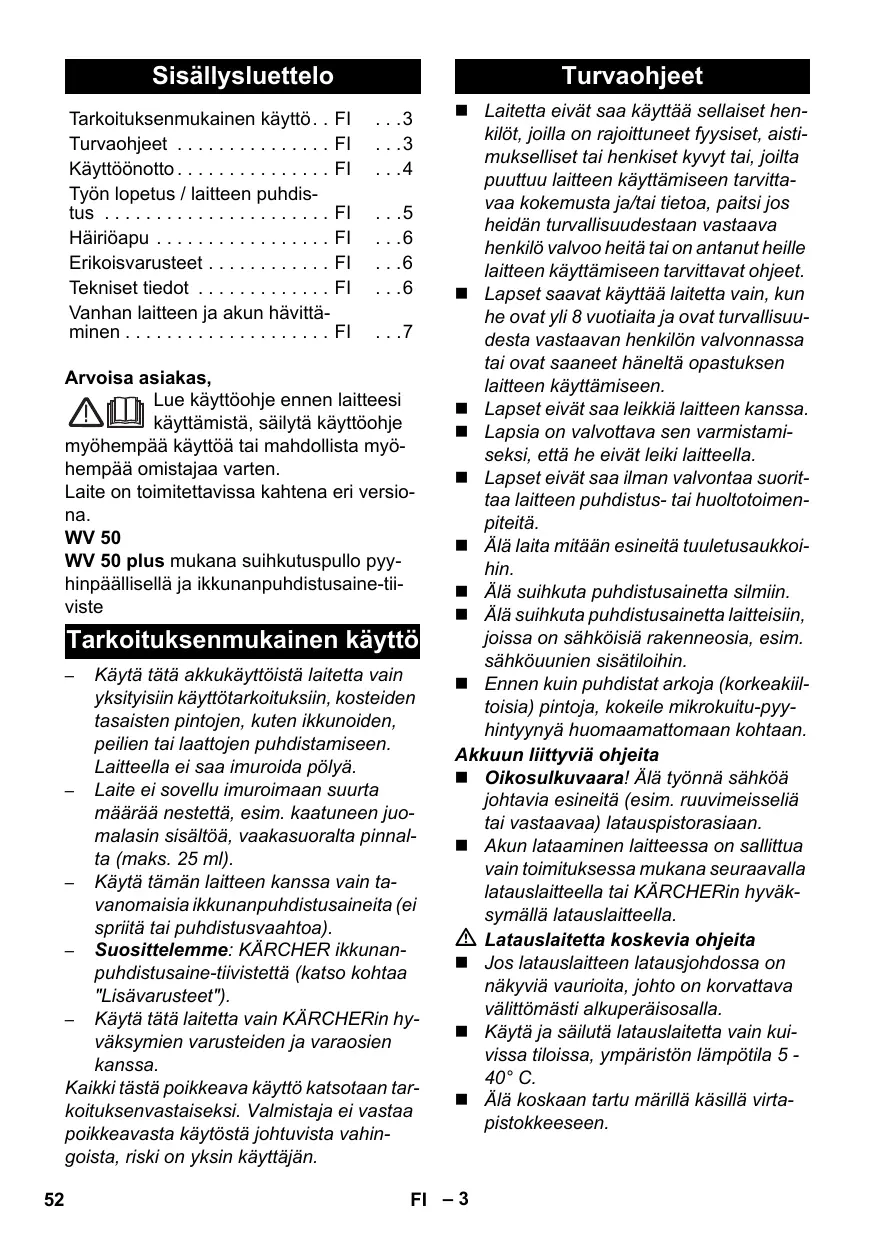 Arvoisa asiakas, Lue käyttöohje ennen laitteesi käyttämistä, säilytä käyttöohje myöhempää käyttöä tai mahdollista myöhempää omistajaa varten. Laite on toimitettavissa kahtena eri versiona. WV 50 WV 50 plus mukana suihkutuspullo pyyhinpäällisellä ja ikkunanpuhdistusaine-tiiviste Tarkoituksenmukainen käyttö Käytä tätä akkukäyttöistä laitetta vain yksityisiin käyttötarkoituksiin, kosteiden tasaisten pintojen, kuten ikkunoiden, peilien tai laattojen puhdistamiseen. Laitteella ei saa imuroida pölyä. – Laite ei sovellu imuroimaan suurta määrää nestettä, esim. kaatuneen juomalasin sisältöä, vaakasuoralta pinnalta (maks. 25 ml). – Käytä tämän laitteen kanssa vain tavanomaisia ikkunanpuhdistusaineita (ei spriitä tai puhdistusvaahtoa). – Suosittelemme: KÄRCHER ikkunanpuhdistusaine-tiivistettä (katso kohtaa "Lisävarusteet"). – Käytä tätä laitetta vain KÄRCHERin hyväksymien varusteiden ja varaosien kanssa. Kaikki tästä poikkeava käyttö katsotaan tarkoituksenvastaiseksi. Valmistaja ei vastaa poikkeavasta käytöstä johtuvista vahingoista, riski on yksin käyttäjän.