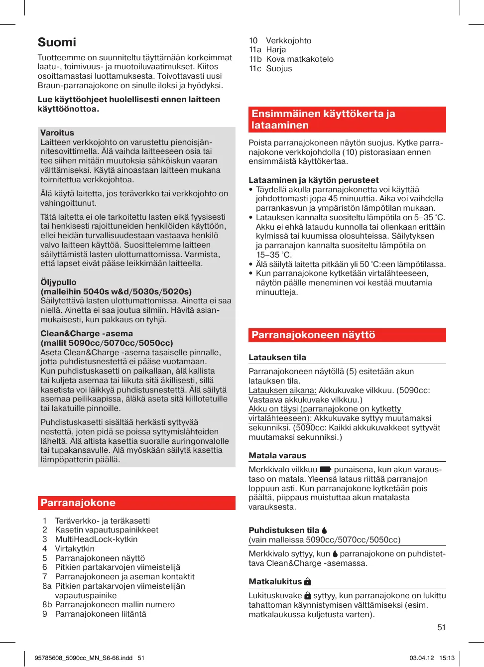 Suomi Tuotteemme on suunniteltu täyttämään korkeimmat laatu-, toimivuus- ja muotoiluvaatimukset. Kiitos osoittamastasi luottamuksesta. Toivottavasti uusi Braun-parranajokone on sinulle iloksi ja hyödyksi. Lue käyttöohjeet huolellisesti ennen laitteen käyttöönottoa. Varoitus Laitteen verkkojohto on varustettu pienoisjännitesovittimella. Älä vaihda laitteeseen osia tai tee siihen mitään muutoksia sähköiskun vaaran välttämiseksi. Käytä ainoastaan laitteen mukana toimitettua verkkojohtoa. Älä käytä laitetta, jos teräverkko tai verkkojohto on vahingoittunut. Tätä laitetta ei ole tarkoitettu lasten eikä fyysisesti tai henkisesti rajoittuneiden henkilöiden käyttöön, ellei heidän turvallisuudestaan vastaava henkilö valvo laitteen käyttöä. Suosittelemme laitteen säilyttämistä lasten ulottumattomissa. Varmista, että lapset eivät pääse leikkimään laitteella. Öljypullo (malleihin 5040s w&d/5030s/5020s) Säilytettävä lasten ulottumattomissa. Ainetta ei saa niellä. Ainetta ei saa joutua silmiin. Hävitä asianmukaisesti, kun pakkaus on tyhjä. Clean&Charge -asema (mallit 5090cc/5070cc/5050cc) Aseta Clean&Charge -asema tasaiselle pinnalle, jotta puhdistusnestettä ei pääse vuotamaan. Kun puhdistuskasetti on paikallaan, älä kallista tai kuljeta asemaa tai liikuta sitä äkillisesti, sillä kasetista voi läikkyä puhdistusnestettä. Älä säilytä asemaa peilikaapissa, äläkä aseta sitä kiillotetuille tai lakatuille pinnoille. Puhdistuskasetti sisältää herkästi syttyvää nestettä, joten pidä se poissa syttymislähteiden läheltä. Älä altista kasettia suoralle auringonvalolle tai tupakansavulle. Älä myöskään säilytä kasettia lämpöpatterin päällä. Parranajokone