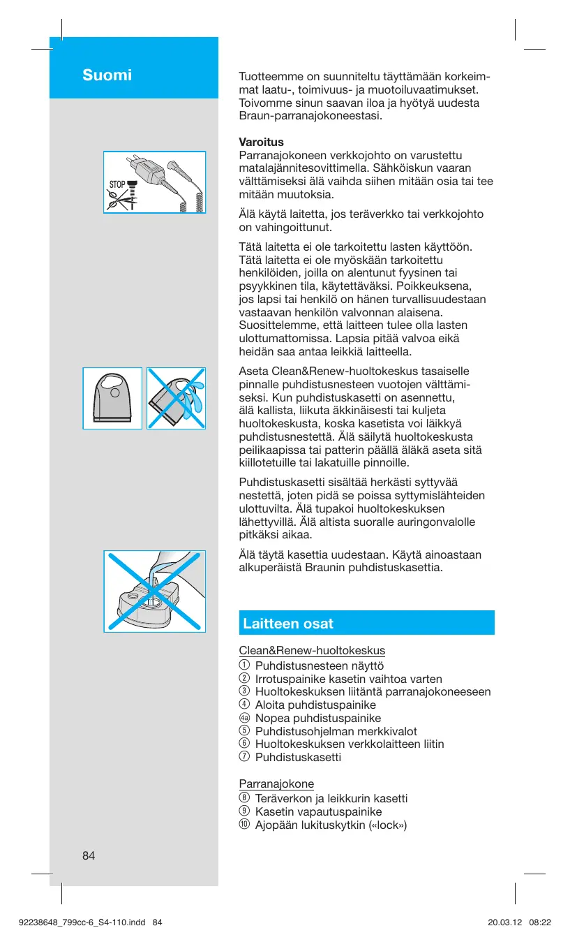 Suomi STOP Tuotteemme on suunniteltu täyttämään korkeimmat laatu-, toimivuus- ja muotoiluvaatimukset. Toivomme sinun saavan iloa ja hyötyä uudesta Braun-parranajokoneestasi. Varoitus Parranajokoneen verkkojohto on varustettu matalajännitesovittimella. Sähköiskun vaaran välttämiseksi älä vaihda siihen mitään osia tai tee mitään muutoksia. Älä käytä laitetta, jos teräverkko tai verkkojohto on vahingoittunut. Tätä laitetta ei ole tarkoitettu lasten käyttöön. Tätä laitetta ei ole myöskään tarkoitettu henkilöiden, joilla on alentunut fyysinen tai psyykkinen tila, käytettäväksi. Poikkeuksena, jos lapsi tai henkilö on hänen turvallisuudestaan vastaavan henkilön valvonnan alaisena. Suosittelemme, että laitteen tulee olla lasten ulottumattomissa. Lapsia pitää valvoa eikä heidän saa antaa leikkiä laitteella. Aseta Clean&Renew-huoltokeskus tasaiselle pinnalle puhdistusnesteen vuotojen välttämiseksi. Kun puhdistuskasetti on asennettu, älä kallista, liikuta äkkinäisesti tai kuljeta huoltokeskusta, koska kasetista voi läikkyä puhdistusnestettä. Älä säilytä huoltokeskusta peilikaapissa tai patterin päällä äläkä aseta sitä kiillotetuille tai lakatuille pinnoille. Puhdistuskasetti sisältää herkästi syttyvää nestettä, joten pidä se poissa syttymislähteiden ulottuvilta. Älä tupakoi huoltokeskuksen lähettyvillä. Älä altista suoralle auringonvalolle pitkäksi aikaa. Älä täytä kasettia uudestaan. Käytä ainoastaan alkuperäistä Braunin puhdistuskasettia. Laitteen osat Clean&Renew-huoltokeskus 1 Puhdistusnesteen näyttö 2 Irrotuspainike kasetin vaihtoa varten 3 Huoltokeskuksen liitäntä parranajokoneeseen 4 Aloita puhdistuspainike D Nopea puhdistuspainike 5 Puhdistusohjelman merkkivalot 6 Huoltokeskuksen verkkolaitteen liitin 7 Puhdistuskasetti Parranajokone Teräverkon ja leikkurin kasetti Kasetin vapautuspainike Ajopään lukituskytkin («lock»)
