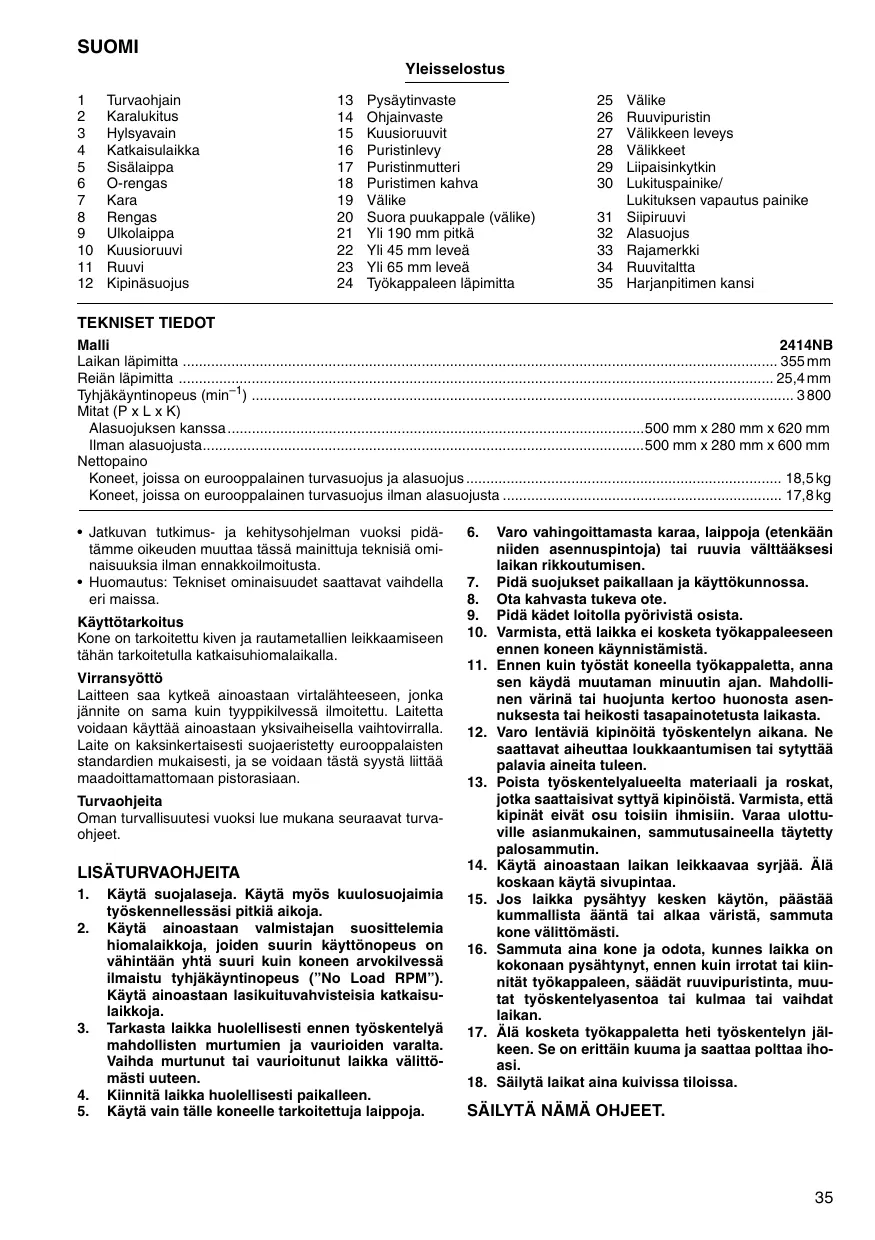 Koneen käyttäminen Pitele kahvasta tiukasti. Käynnistä kone ja odota, kunnes laikka on saavuttanut täyden nopeutensa, ennen kuin lasket sitä varovasti sahausta varten. Kun laikka osuu tyôkappaleeseen, sahaa painamalla sità vähitellen alas- päin Kahvasta. Kün sahaus on valmis, sammuta kone ja ODOTA, KUNNES LAIKKA ON KOKONAAN PYSÂHTY- NYT, ennen kuin palautat kahvan kokonaan ylôs.