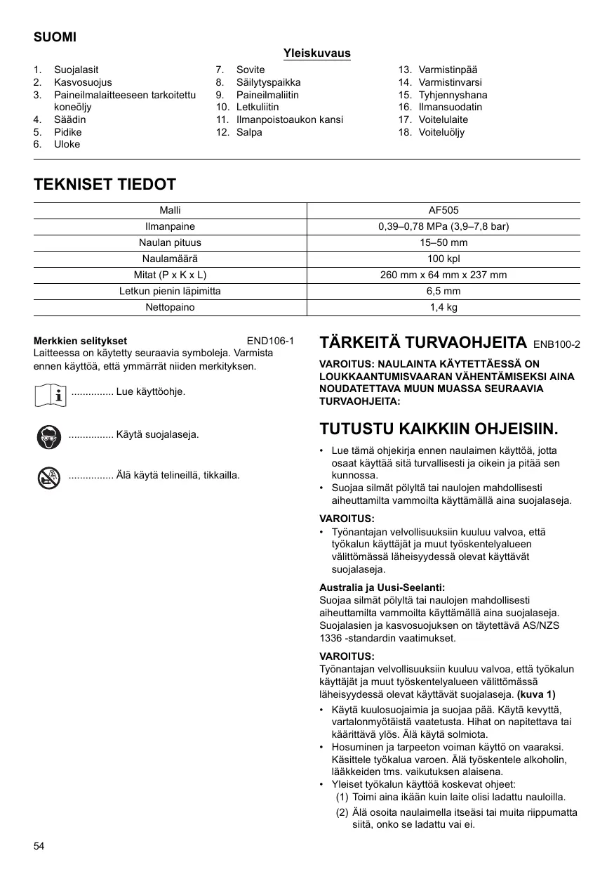 Yleiset tyokalun kayttoa koskevat oheet: (1) Toimi aina ikaan kuin laite olisi ladattu nauloilla. (2) Alosoita naulaimella itseasi tai muita riippumatta siita, onko se ladattu vai ei.