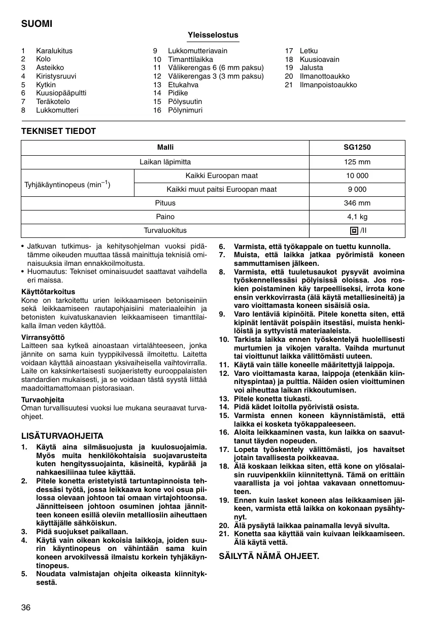 SUOMI Yleisselostus 1 Karalukitus 9 Lukkomutteriavain 17 Letku 2 Kolo 10. Timanttilikka 18 Kuusioavain 3 Asteikko 11. Välikerengas 6 (6 mmpaksu) 19 Jalusta 4 Kiistysruuvi 12. Välikerengas 3 (3 mm paksu) 20 Imanottoaukko 5 Kykin 13 Etukahva 21 Imanpoistoaukko 6 Küusiopääpulti 14. Pidike 7 Teräkotelo 15. Pülysuutin 8 Lukkomutteri 16. Pülynimuri TEKNISET TIEDOT Malli SG1250 Laikan läpimitta 125 mm Kaikki Euroopan maat 10 000 ” : Thiäkäyntinopeus (min) Kaikki muut paitsi Euroopan maat 9 000 Pituus 346 mm Paino 41kg Turvaluokitus EI + Jatkuvan tutkimus- ja kehitysohjelman vuoksi pidä- 6. Varmista, että tyôkappale on tuettu kunnolla. tämme oikeuden muuttaa tässä mainittuja teknisiä omi- 7. Muista, että laikka jatkaa pyôrimistä koneen naisuuksia man ennakkoilmoitusta. sammuttamisen jälkeen. + Huomautus: Tekniset ominaïsuudet saattavat vaihdella 8. Varmista, että tuuletusaukot pysyvät avoimina eri maissa tyéskennellessäsi pélyisissä oloissa. Jos ros- Käyttôtarkoitus Kien poistaminen käy tarpeelliseksi, irrota kone Kone on tarkoitettu urien leikkaamiseen_betoniseiniin sekä leikkaamiseen rautapohjaisiini_ materiaaleihin_ ja de e à betonisten kuivatuskanavien leikkaamiseen timanttlai 9 Varo lentäviä kipinôitä. Pitele konetta siten, että Kalla iman veden käyttôà. Kipinätlentävät polspäin Rsestäsl, mulsta henk- Virransyôttô 40. Fadela laikka ennen tyôskentelyä huolellisesti Laitteen saa kytkeä ainoastaan virtalähteeseen, jonka murtumien ja vikojen varalta. Vaihda murtunut iännite on sama kuin tyyppikivessä iimoitettu. Laitetta voidaan käyttäà ainoastaan yksivaiheisella vaihtovirralla. 11 älle koneelle määritettyjä laippoja. Laite on kaksinkertaisesti suojaeristetty eurooppalaisten 12. ppoja (etenkään klin- standardien mukaisesti ja se voidaan tästäà syystà littäà en osien vioittuminen maadoittamattomaan pistorasiaan. Turvaohjeita 13. Pitele konetta Oman turvallisuutesi vuoksi lue mukana seuraavat turva- 14. Pidä kädet loitolla pyôrivistä osista. ohjeet 15. Varmista ennen koneen käynnistämistä, että laikka ei kosketa tyôkappaleeseen. LISÂTURVAOHIEITA 16. ikkaaminen vasta, kun laikka on saavut- A un jden nopeuden. 1. Käytä aina silmäsuojusta ja kuulosuojaimia. 17. Lopeta tyôskentely välittômästi, jos havaitset Myôs muita_henkilëkohtaisia suojavarusteita jotain tavallisesta poikkeavaa. kuten hengityssuojainta, käsineitä, kypärää ja 18. Âlä koskaan leikkaa siten, että kone on ylôsalai- nahkaesiliinaa tulee käyttää. sin ruuvipenkkiin kiinnitettynä. Tämä on erittäin 2. Pitele konetta eristetyistä tartuntapinnoista teh- vaarallista ja voi johtsa vakavaan onnettomuu- dessäsi tyôtä, jossa lelkkaava kone voi osua pil- teen. lossa olevaan johtoon tai omaan virtajohtoonsa. 19, Ennen kuin lasket koneen alas leikkaamisen jäl- Jännitteiseen johtoon osuminen johtaa Keen, varmista että laikka on kokonaan pysähty- oleviin metalliosiin aiheuttaen nyt Käyttäjälle sähkôiskun. 20. Àlà pysäytä laikkaa painamalla levyä sivulta. 3. Pidä suojukset paikallaan. 21. Konetta saa käyttää vain kuivaan leikkaamiseen. 4. Käytä vain oikean kokolsia laikkoja, joiden suu- Àlà käytä vettä. rin_käyntinopeus on Sama kuin koneen arvokilvessä ilmaistu korkein tyhjäkäyn- SÂILYTÂ NÂMÂ OHJEET. tinopeus. 5. Noudata valmistajan ohjeita oikeasta kiinnityk-