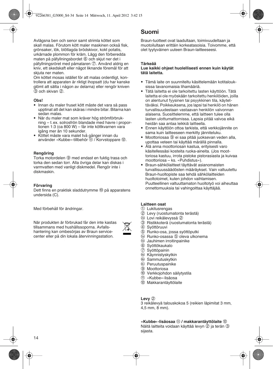 - Jauhattaessasi aineksia, joiden käsittely kulut-taa runsaasti energiaa – esim. auringonkukansiemeniä ja kauraa suhteessa 1:3 (noin 800 W) – älä käytä konetta 10 sekuntia kauempaa. 11 / mak• Ennen kuin käytät «Kubbe»-lisäosaa + karantäyttölaite l, liha on jauhettava kahdesti. Puhdistus Pyyhi moottoriyksikkö puhtaaksi 9 kostealla liinalla ja kuivaa se. Muut osat voidaan pestä kuumalla vedellä tavallisilla tiskiaineilla. Älä pese astianpesukoneessa. Säilytys Verkkojohdolle on kätevä säilytystila j laitteen pohjassa (C). Muutosoikeus pidätetään. Kun laite on tullut elinkaarensa päähän, säästä ympäristöä äläkä hävitä sitä kotitalousjätteiden mukana. Hävitä tuote viemällä se Braunhuoltoliikkeeseen tai asianmukaiseen keräyspisteeseen. Käyttö Käynnistä moottori ennen lihan, kalan, vihanneksien tms. syöttämistä laitteeseen. Käynnistä moottori painamalla kytkintä H. Sammuta laitteesta virta painamalla sammutuskytkintä Jos laite on tukkeutunut, pysäytä se painamalla sammutuskytkintä h. Paina sitten peruutuspainiketta ∞ (enintään 10 sekuntia). Kun haluat jatkaa jauhamista, paina kytkintä uudestaan. Tärkeää: Odota, että laite pysähtyy täysin, ennen peruutuspainikkeen tai käynnistyskytkimen painamista.