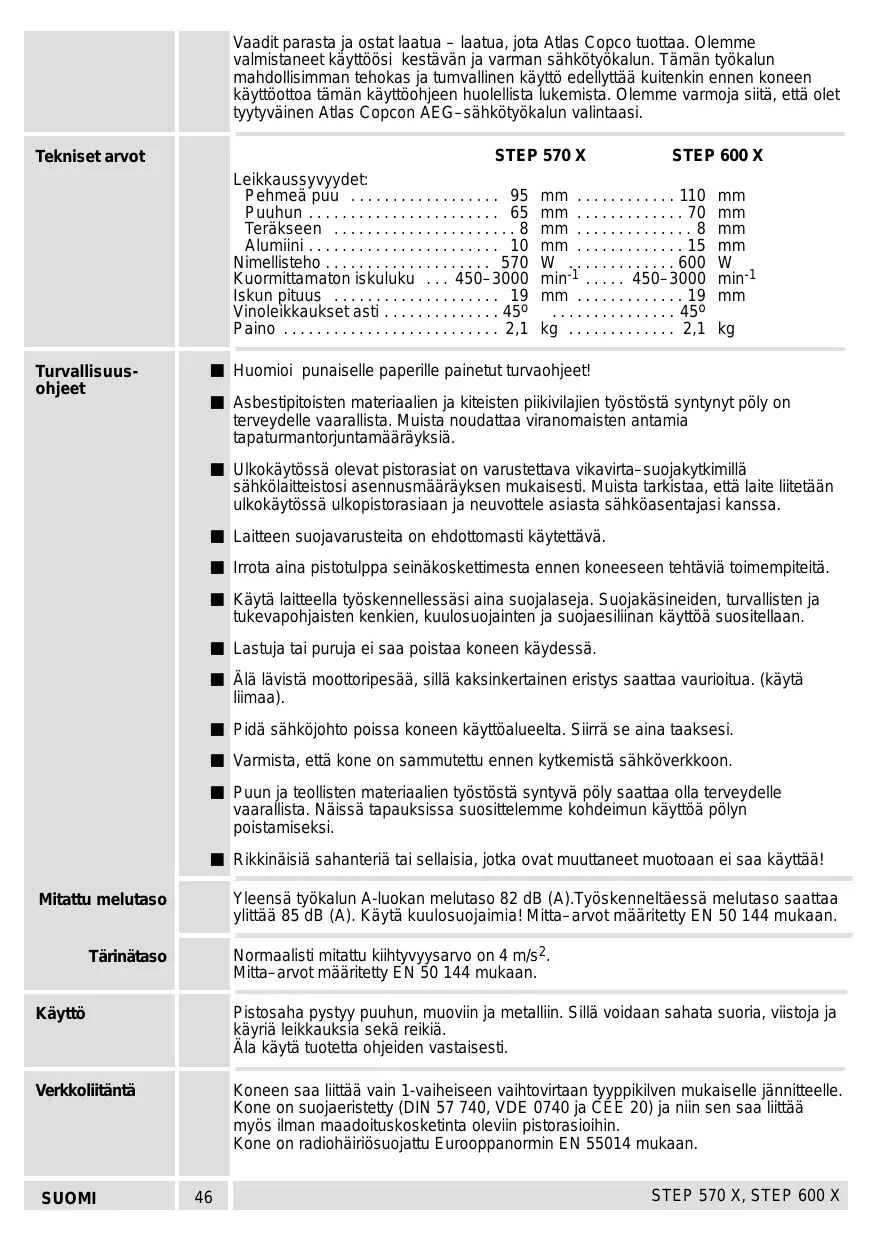- Vaadit parasta ja ostat laatua – laatua, jota Atlas Copco tuottaa. Olemme valmistaneet käyttöösi kestävän ja varman sähkötyökalun. Tämän työkalun mahdollisimman tehokas ja tumvallinen käyttö edellyttää kuitenkin ennen koneen käyttöottoa tämän käyttöohjeen huolellista lukemista. Olemme varmoja siitä, että olet tyytyväinen Atlas Copcon AEG–sähkötyökalun valintaasi. STEP 570 X STEP 600 X Leikkaussyvyydet: Pehmeä puu p. 95