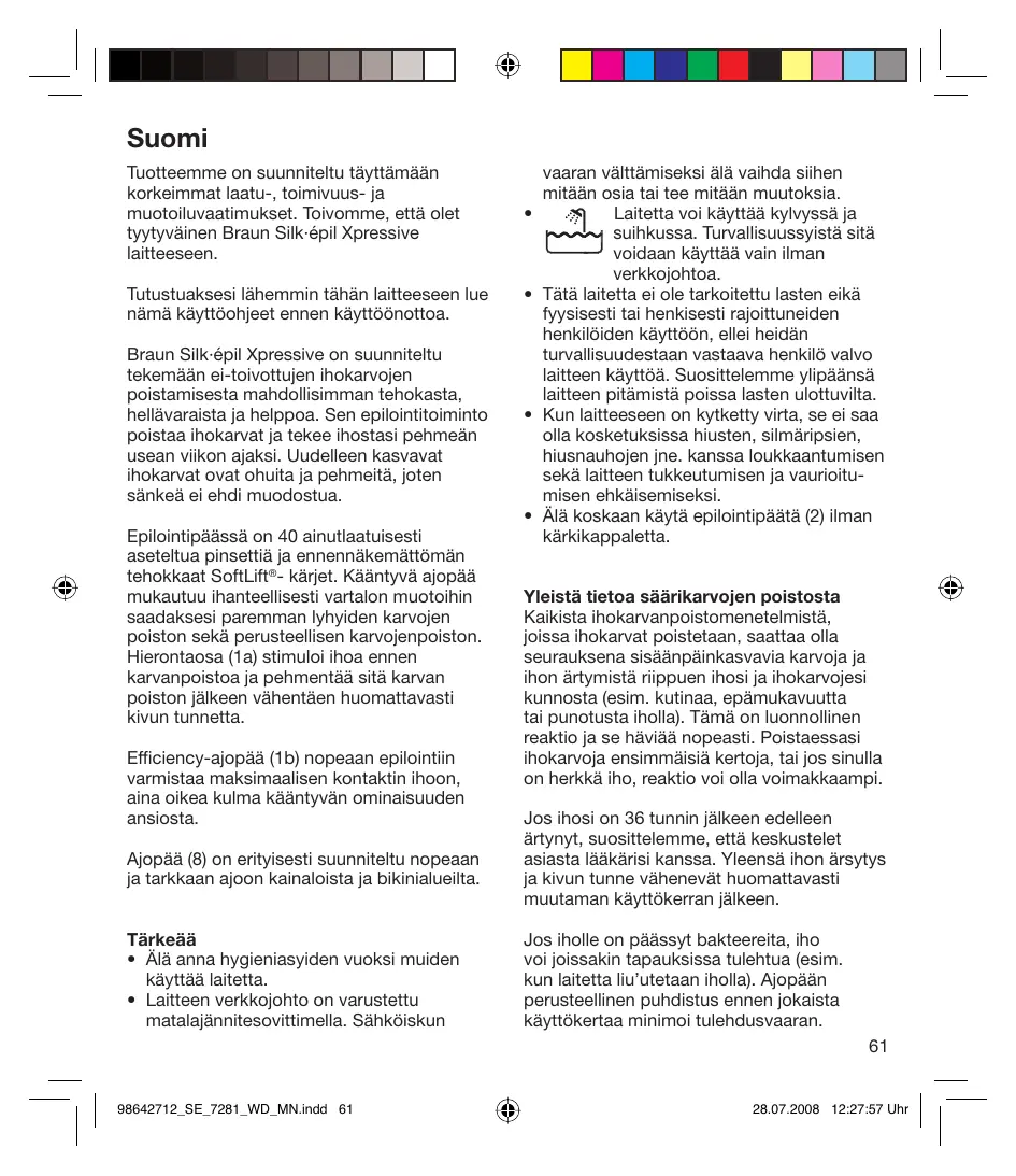 Suomi Tuotteemme on suunniteltu täyttämään korkeimmat laatu-, toimivuus- ja muotoiluvaatimukset. Toivomme, että olet tyytyväinen Braun Silk·épil Xpressive laitteeseen. Tutustuaksesi lähemmin tähän laitteeseen lue nämä käyttöohjeet ennen käyttöönottoa. Braun Silk·épil Xpressive on suunniteltu tekemään ei-toivottujen ihokarvojen poistamisesta mahdollisimman tehokasta, hellävaraista ja helppoa. Sen epilointitoiminto poistaa ihokarvat ja tekee ihostasi pehmeän usean viikon ajaksi. Uudelleen kasvavat ihokarvat ovat ohuita ja pehmeitä, joten sänkeä ei ehdi muodostua.