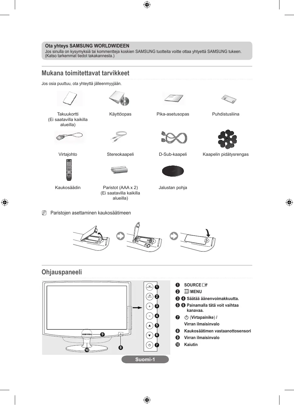 Ota yhteys SAMSUNG WORLDWIDEEN Jos sinulla on kysymyksià tai kommentteja koskien SAMSUNG tuotteita voitte ottaa yhtyettä SAMSUNG tukeen. {Katso tarkemmat tiedot takakannesta.) Mukana toimitettavat tarvikkeet Jos osia puuttuu, ota yhteyitä jäleenmyyjään. D Z Takuukortti Käyttéopas Pika-asetusopas Puhdistuslina (Ei saatavilla kaikilla alueilla) Ces 2 CO Virtajohto Stereokaapeli D-Sub-kaapeli Kaapelin pidätysrengas Kaukosäädin Paristot (AAA x 2) Jalustan pohja (Ei saatavilla kaikilla alueilla) Paristojen asettaminen kaukosäätimeen © SOURCEC# © IDMENU © © Säätää äänenvoimakkuutta. © © Painamalla tätä voit vaihtaa kanavaa. © © (Virtapainike) / Virran ilmaisinvalo Kaukosäätimen vastaanottosensori Virran ilmaisinvalo Kaiutin