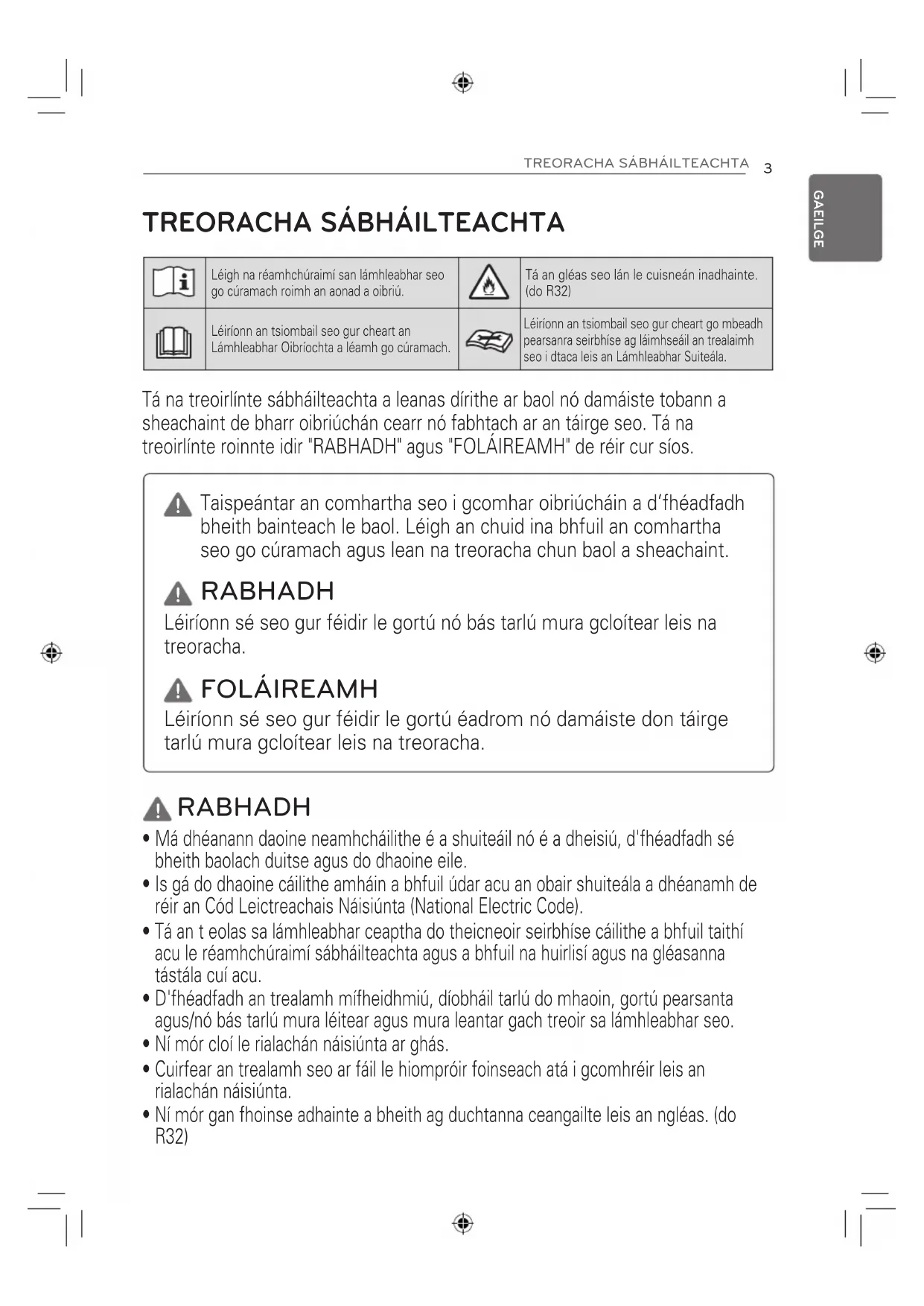 Léigh na réamhchúraimí san lámhleabhar seo go cúramach roimh an aonad a oibriú. Tá an gléas seo lán le cuisneán inadhainte. (do R32) Léiríonn an tsiombail seo gur cheart an Lámhleabhar Oibríochta a léamh go cúramach. Léiríonn an tsiombail seo gur cheart go mbeadh pearsanra seirbhíse ag láimhseáil an trealaimh seo i dtaca leis an Lámhleabhar Suiteála. RABHADH Léiríonn sé seo gur féidir le gortú nó bás tarlú mura gcloítear leis na treoracha. FOLÁIREAMH Léiríonn sé seo gur féidir le gortú éadrom nó damáiste don táirge tarlú mura gcloítear leis na treoracha. Taispeántar an comhartha seo i gcomhar oibriúcháin a d’fhéadfadh bheith bainteach le baol. Léigh an chuid ina bhfuil an comhartha seo go cúramach agus lean na treoracha chun baol a sheachaint.