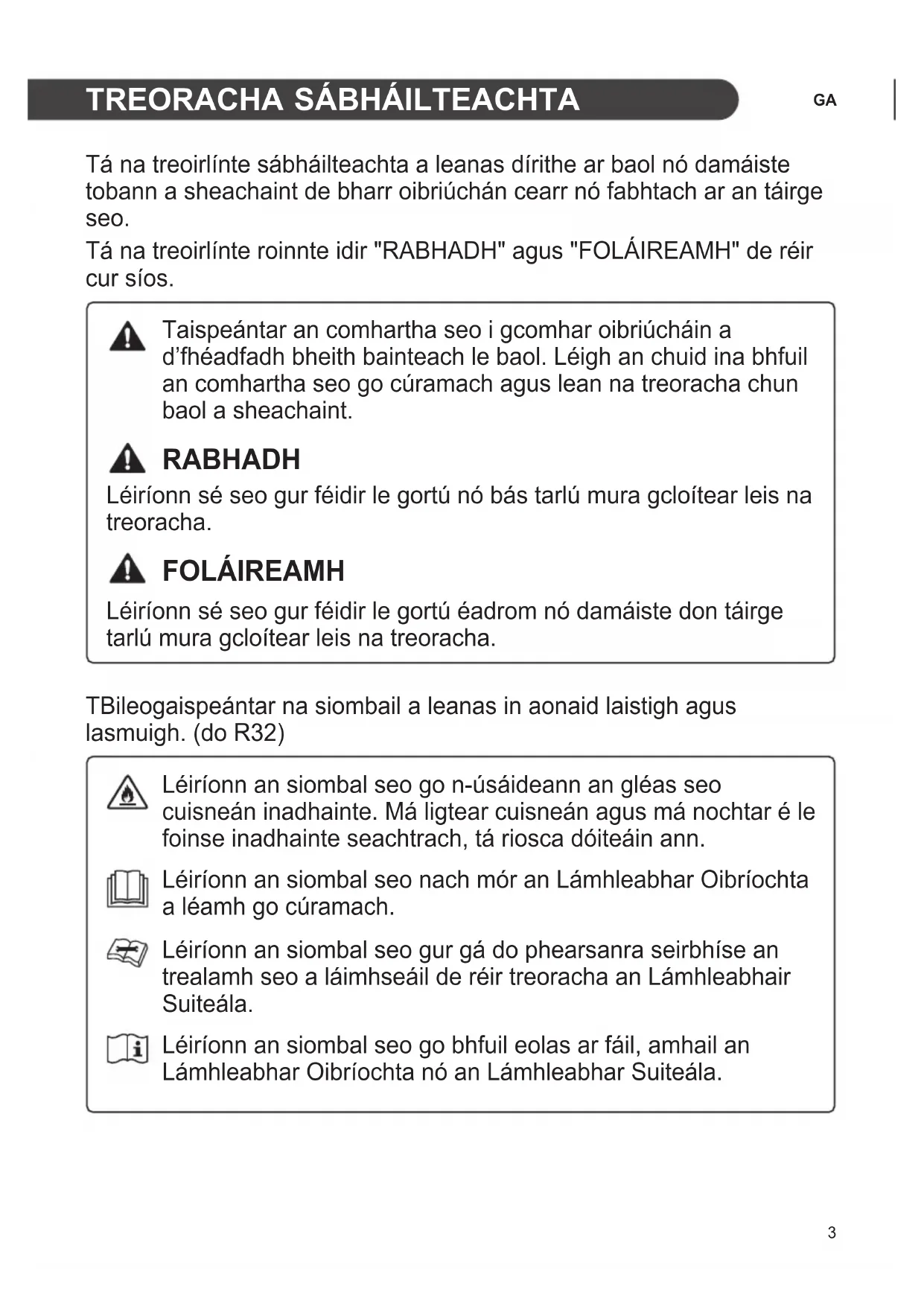 Tá na treoirlínte sábháilteachta a leanas dírithe ar baol nó damáiste tobann a sheachaint de bharr oibriúchán cearr nó fabhtach ar an táirge seo. Tá na treoirlínte roinnte idir "RABHADH" agus "FOLÁIREAMH" de réir cur síos. Taispeántar an comhartha seo i gcomhar oibriúcháin a d’fhéadfadh bheith bainteach le baol. Léigh an chuid ina bhfuil an comhartha seo go cúramach agus lean na treoracha chun baol a sheachaint. RABHADH Léiríonn sé seo gur féidir le gortú nó bás tarlú mura gcloítear leis na treoracha. FOLÁIREAMH Léiríonn sé seo gur féidir le gortú éadrom nó damáiste don táirge tarlú mura gcloítear leis na treoracha. TBileogaispeántar na siombail a leanas in aonaid laistigh agus lasmuigh. (do R32) Léiríonn an siombal seo go n-úsáideann an gléas seo cuisneán inadhainte. Má ligtear cuisneán agus má nochtar é le foinse inadhainte seachtrach, tá riosca dóiteáin ann. Léiríonn an siombal seo nach mór an Lámhleabhar Oibríochta a léamh go cúramach. Léiríonn an siombal seo gur gá do phearsanra seirbhíse an trealamh seo a láimhseáil de réir treoracha an Lámhleabhair Suiteála. Léiríonn an siombal seo go bhfuil eolas ar fáil, amhail an Lámhleabhar Oibríochta nó an Lámhleabhar Suiteála.4