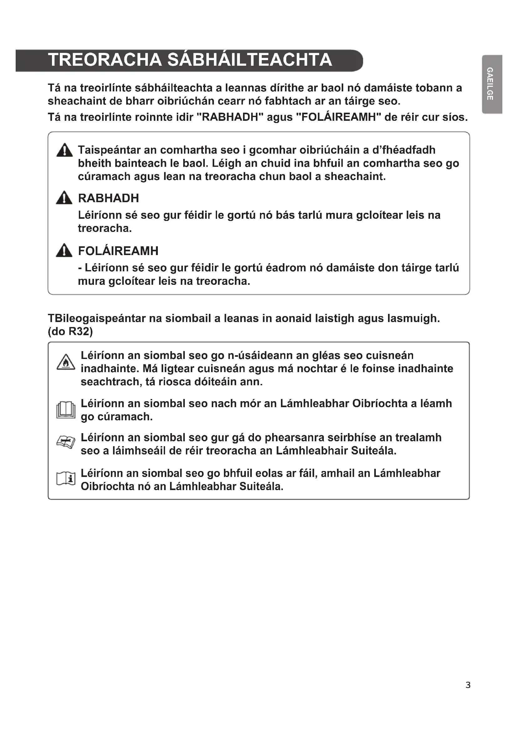Tá na treoirlínte sábháilteachta a leannas dírithe ar baol nó damáiste tobann a sheachaint de bharr oibriúchán cearr nó fabhtach ar an táirge seo. Tá na treoirlínte roinnte idir "RABHADH" agus "FOLÁIREAMH" de réir cur síos. Taispeántar an comhartha seo i gcomhar oibriúcháin a d’fhéadfadh bheith bainteach le baol. Léigh an chuid ina bhfuil an comhartha seo go cúramach agus lean na treoracha chun baol a sheachaint. RABHADH Léiríonn sé seo gur féidir le gortú nó bás tarlú mura gcloítear leis na treoracha. FOLÁIREAMH - Léiríonn sé seo gur féidir le gortú éadrom nó damáiste don táirge tarlú mura gcloítear leis na treoracha. TBileogaispeántar na siombail a leanas in aonaid laistigh agus lasmuigh. (do R32) Léiríonn an siombal seo go n-úsáideann an gléas seo cuisneán inadhainte. Má ligtear cuisneán agus má nochtar é le foinse inadhainte seachtrach, tá riosca dóiteáin ann. Léiríonn an siombal seo nach mór an Lámhleabhar Oibríochta a léamh go cúramach. Léiríonn an siombal seo gur gá do phearsanra seirbhíse an trealamh seo a láimhseáil de réir treoracha an Lámhleabhair Suiteála. Léiríonn an siombal seo go bhfuil eolas ar fáil, amhail an Lámhleabhar Oibríochta nó an Lámhleabhar Suiteála.4 Treoracha Sábháilteachta Tábhachtacha RABHADH Chun baol pléascadh, tine, báis, turrainge, gortú nó scalladh a sheachaint agus an táirge seo in úsáid agat, lean na treoracha réamhchúraim chomh maith leis an méid seo: Suiteáil