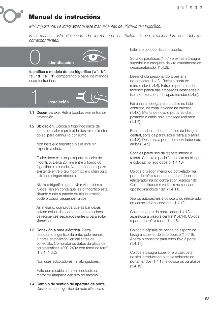 Débranchez le réfrigérateur ou activez la fonction vacances pour les longues périodes de temps où vous n’allez pas utiliser l’appareil. Vous réduirez la consommation et vous économiserez de l’énergie. Éviter de garder les portes ouvertes durant plus de temps que nécessaire, car cela suppose une augmentation de la dépense énergétique. Gestion des résidus d’appareils électriques et électroniques. Le symbole indique que l’on ne doit pas se débarrasser de l’appareil en utilisant les conteneurs traditionnels pour les résidus domestiques. Remettez votre appareil frigorifique dans un centre de reprise spécifique. Le recyclage des appareils électroménagers évite des conséquences négatives pour la santé et l’environnement et permet d’économiser de l’énergie et des ressources. Pour plus d’information, veuillez contacter les autorités locales ou l’établissement où vous avez acquis votre appareil frigorifique.