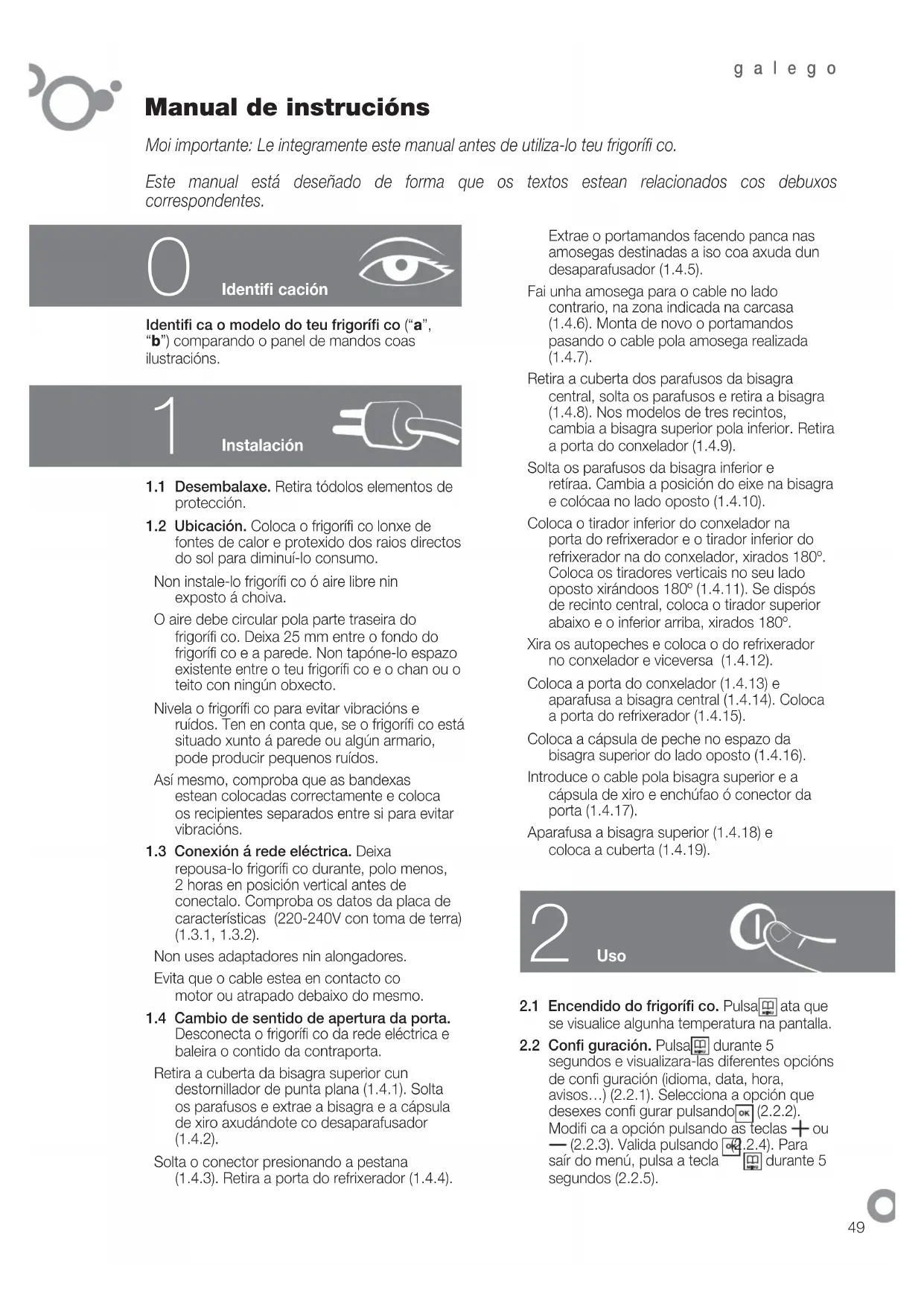 1.4 Cambio de sentido de aperture da porta. Desconecta o frigoríf co da rede électrique e baleira o contento da contraporta.