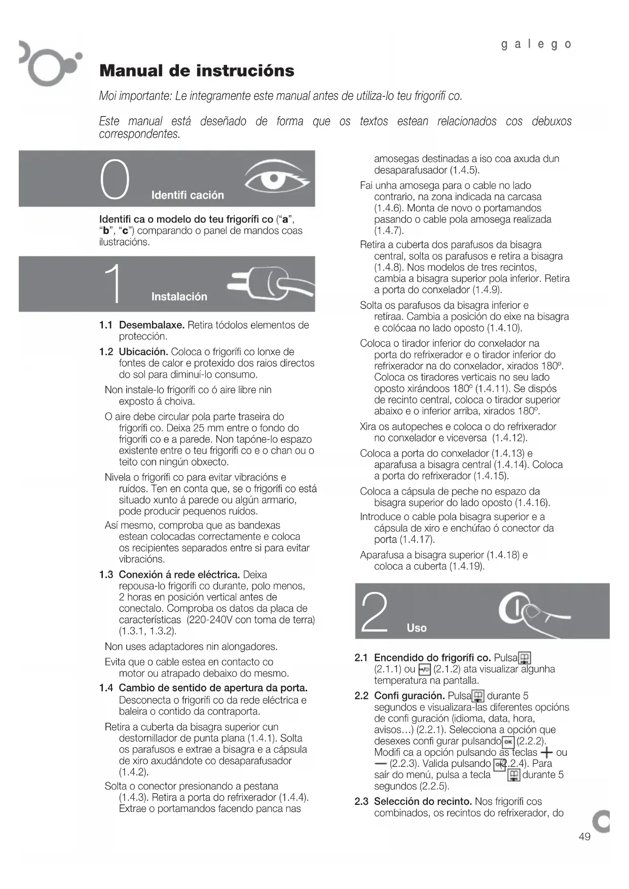 Manual de instrucións Moi importante: Le integramente este manual antes de utiliza-lo teu frigorífi co. Este manual está deseñado de forma que os textos estean relacionados cos debuxos correspondentes. Instalación Identifi ca o modelo do teu frigorífi co (“a”, “b”, “c”) comparando o panel de mandos coas ilustracións.