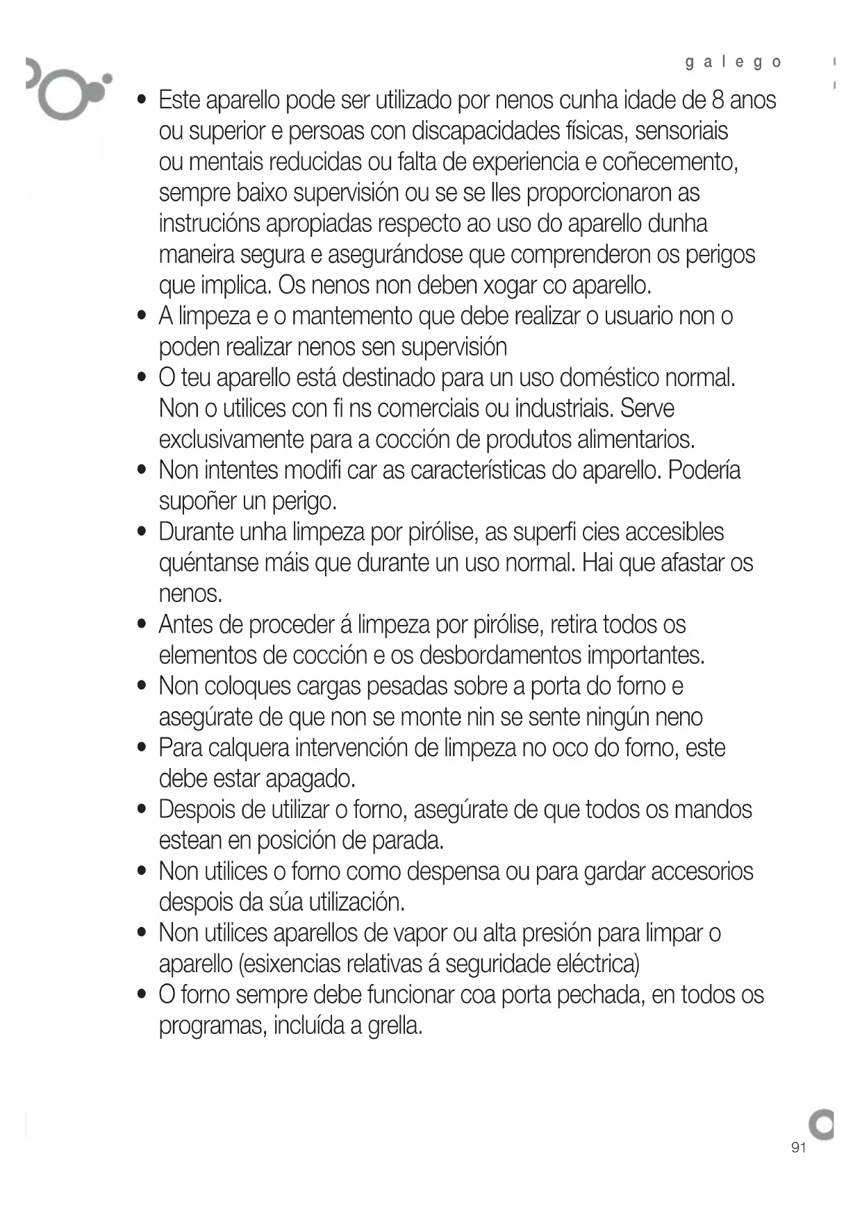 - Durante unha limpeza por pirólise, as superfi cies accesibles quéntanse máis que durante un uso normal. Hai que afastar os nenos.