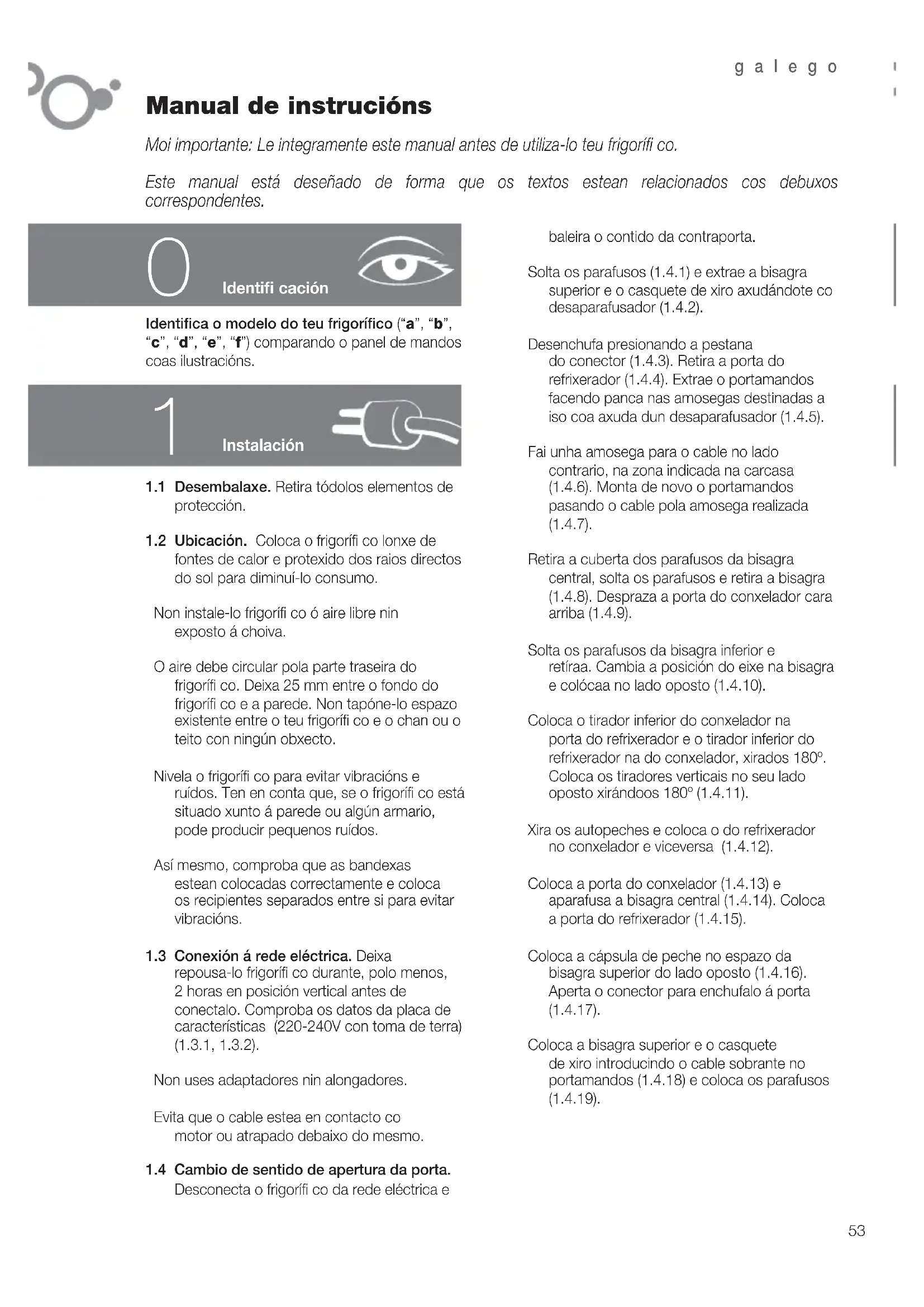 Manual de instrucións Moi importante: Le integramente este manual antes de utiliza-lo teu frigorífi co. Este manual está deseñado de forma que os textos estean relacionados cos debuxos correspondentes. Instalación Identifi ca o modelo do teu frigorífi co (“a”, “b”, “c”, “d”, “e”, “f”) comparando o panel de mandos coas ilustracións.