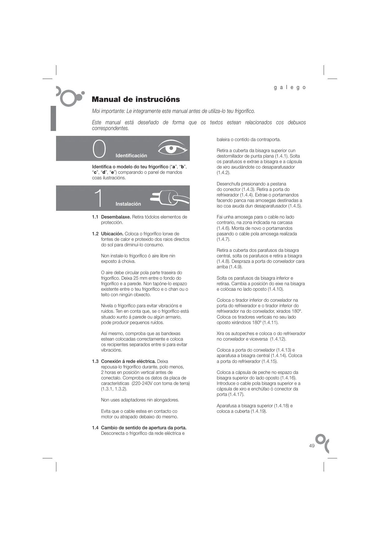 Manual de instrucións Moi importante: Le integramente este manual antes de utiliza-lo teu frigorífico. Este manual está deseñado de forma que os textos estean relacionados cos debuxos correspondentes.