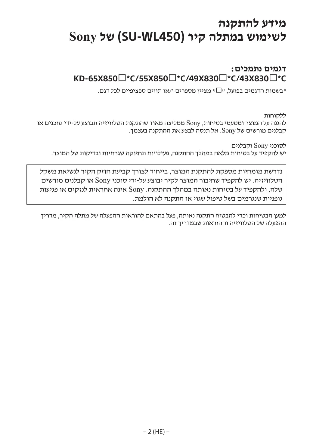 L’installation de ce produit exige un certain savoir-faire. Lisez ce mode d’emploi attentivement afin de procéder à l’installation en toute sécurité. Sony ne saurait être tenue responsable de tout dommage ou de toute blessure découlant d’une mauvaise utilisation ou d’une installation incorrecte. Une fois l’installation terminée, veuillez remettre ce manuel d’installation au client. Ce mode d’emploi indique comment manipuler le produit correctement et contient des précautions essentielles à prendre pour éviter tout accident. Lisez attentivement ce mode d’emploi et veillez à utiliser le produit correctement. Conservez ce mode d’emploi pour toute référence ultérieure. Les produits Sony sont conçus pour vous offrir le maximum de sécurité. Toutefois, si les produits sont utilisés de façon incorrecte, ils peuvent entraîner des blessures graves en provoquant un incendie ou l’électrocution, ou encore la chute de l’appareil hors de son support. Veillez à observer les consignes de sécurité préconisées pour éviter de tels accidents.