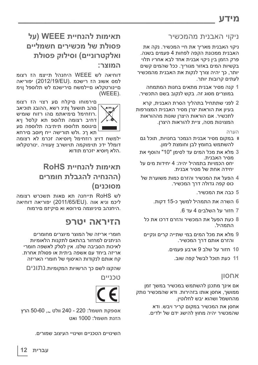 לחשמלאי לקבלת עצה. אין לטבול במים או בכל נוזל אחר את המכשיר ,את כבל החשמל או את תקע החשמל. אין להחזיק אותו מתחת למים זורמים ואין לנקות חלקים כלשהם במדיח כלים .רק את סלסילת המסנן ואת כד הזכוכית ניתן לנקות בבטחה במדף העליון של מדיח הכלים או במים וסבון כלים. נתק את שקע החשמל לאחר השימוש במכשיר ,לפני ניקויו, לפני היציאה מהחדר או אם אירעה תקלה .אין לנתק את התקע מהחשמל על ידי משיכת הכבל. אין למעוך או לכופף את כבל החשמל ואין לשפשף אותו על קצוות חדשים כדי למנוע נזק כלשהו. הרחק את כבל החשמל ממשטחים חמים ומלהבות חשופות. אין להשתמש במכשיר בכבל מאריך. בשום פנים ואופן אין להשתמש במכשיר אם כבל החשמל או המכשיר עצמו פגומים. המכשירים שלנו לשימוש