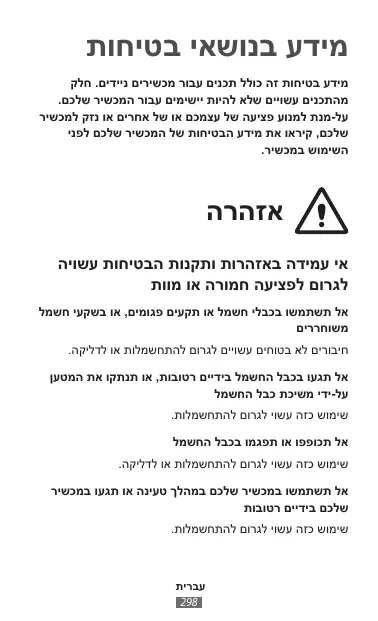 אל תגרמו לקצר במטען או במכשיר שימוש כזה עשוי לגרום להתחשמלות או לדליקה ,או לפעולה לא תקינה או התפוצצות של הסוללה. אל תשתמשו במכשיר שלכם בחוץ במהלך סופת רעמים שימוש כזה עשוי לגרום להתחשמלות או לפעולה לא תקינה של השתמשו בסוללות ,מטענים ,אביזרים ופריטים המאושרים על-ידי