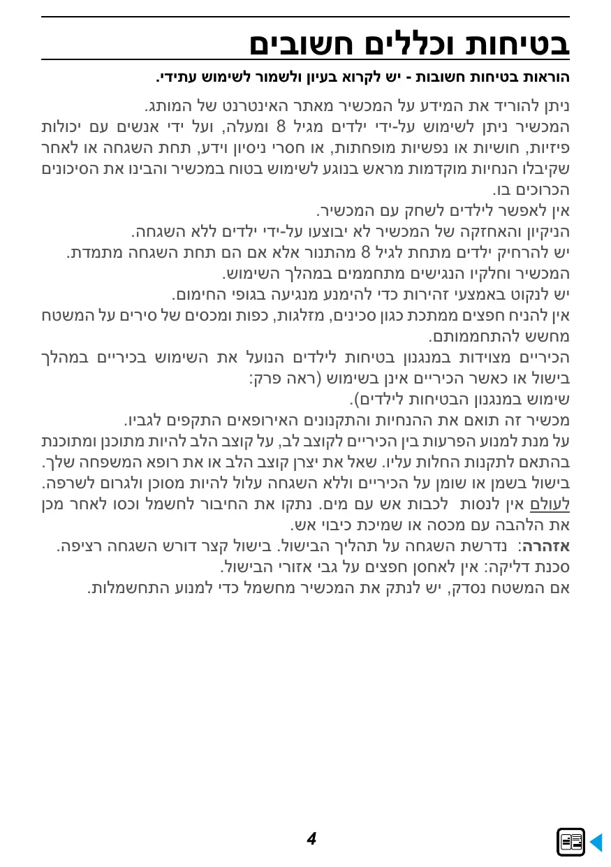 ניתן להוריד את המידע על המכשיר מאתר האינטרנט של המותג. המכשיר ניתן לשימוש על-ידי ילדים מגיל 8ומעלה ,ועל ידי אנשים עם יכולות פיזיות ,חושיות או נפשיות מופחתות ,או חסרי ניסיון וידע ,תחת השגחה או לאחר שקיבלו הנחיות מוקדמות מראש בנוגע לשימוש בטוח במכשיר והבינו את הסיכונים הכרוכים בו. אין לאפשר לילדים לשחק עם המכשיר. הניקיון והאחזקה של המכשיר לא יבוצעו על-ידי ילדים ללא השגחה. יש להרחיק ילדים מתחת לגיל 8מהתנור אלא אם הם תחת השגחה מתמדת. המכשיר וחלקיו הנגישים מתחממים במהלך השימוש. יש לנקוט באמצעי זהירות כדי להימנע מנגיעה בגופי החימום. אין להניח חפצים ממתכת כגון סכינים ,מזלגות ,כפות ומכסים של סירים על המשטח מחשש להתחממותם. הכיריים מצוידות במנגנון בטיחות לילדים הנועל את השימוש בכיריים במהלך בישול או כאשר הכיריים אינן בשימוש (ראה פרק: שימוש במנגנון הבטיחות לילדים). מכשיר זה תואם את ההנחיות והתקנונים האירופאים התקפים לגביו. על מנת למנוע הפרעות בין הכיריים לקוצב לב ,על קוצב הלב להיות מתוכנן ומתוכנת בהתאם לתקנות החלות עליו .שאל את יצרן קוצב הלב או את רופא המשפחה שלך. בישול בשמן או שומן על הכיריים וללא השגחה עלול להיות מסוכן ולגרום לשרפה. לעולם אין לנסות לכבות אש עם מים .נתקו את החיבור לחשמל וכסו לאחר מכן את הלהבה עם מכסה או שמיכת כיבוי אש. אזהרה :נדרשת השגחה על תהליך הבישול .בישול קצר דורש השגחה רציפה. סכנת דליקה :אין לאחסן חפצים על גבי אזורי הבישול. אם המשטח נסדק ,יש לנתק את המכשיר מחשמל כדי למנוע התחשמלות.