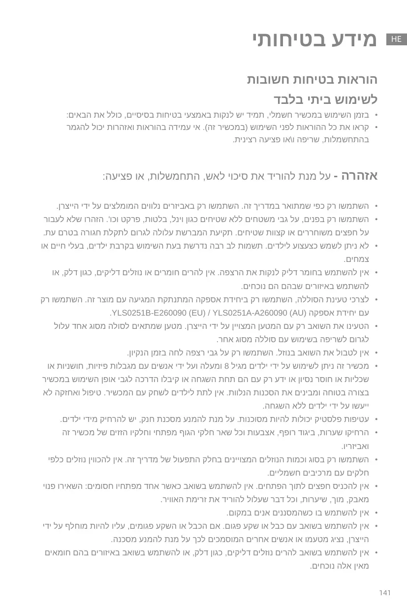 • N'utilisez l'appareil qu'à l'intérieur, sur des surfaces de sol non recouvertes de tapis, comme le vinyle, le carrelage, le bois scellé, etc. Veillez à ne pas rouler sur des objets non fixés ou sur les bords d'un tapis. Le fait de faire caler la brosse peut entraîner une défaillance prématurée de la courroie. • Ne laissez pas l'appareil être utilisé comme un jouet. Une attention particulière est nécessaire lorsqu'elle est utilisée par ou près d'enfants, d'animaux domestiques ou de plantes. • Ne pas utiliser un liquide inflammable ou combustible pour nettoyer un sol./Ne pas utiliser pour ramasser des liquides inflammables ou combustibles, tels que l'essence, ou utiliser dans des zones où ils peuvent être présents. • Pour recharger la batterie, utilisez uniquement le bloc d'alimentation amovible fourni avec cet appareil. Utilisez uniquement le bloc d'alimentation YLS0251B-E260090 (EU) / YLS0251A-A260090 (AU). • Rechargez l'aspirateur uniquement avec le chargeur spécifié par le fabricant. Un chargeur qui convient à un type de batterie peut créer un risque d'incendie lorsqu'il est utilisé avec un autre type de batterie. • Ne plongez pas l'aspirateur dans un liquide. Utilisez-le uniquement sur un sol humidifié par le processus de nettoyage. • Cet appareil peut être utilisé par des enfants à partir de 8 ans et des personnes ayant des capacités physiques, sensorielles ou mentales réduites ou un manque d'expérience et de connaissances s'ils ont reçu une supervision ou des instructions concernant l'utilisation de l'appareil en toute sécurité et s'ils comprennent les risques encourus. Les enfants ne doivent pas jouer avec l'appareil. Le nettoyage et l'entretien par l'utilisateur ne doivent pas être effectués par des enfants sans surveillance. • Le film plastique peut être dangereux. Pour éviter tout risque de suffocation, tenez-le à l'écart des enfants. • Tenez les cheveux, les vêtements amples, les doigts et toutes les parties du corps éloignés des ouvertures et des parties mobiles de l'appareil et de ses accessoires. • N'utilisez que le type et la quantité de liquides spécifiés dans la section "Opérations" de ce guide. Le liquide ne doit pas être dirigé vers des équipements contenant des