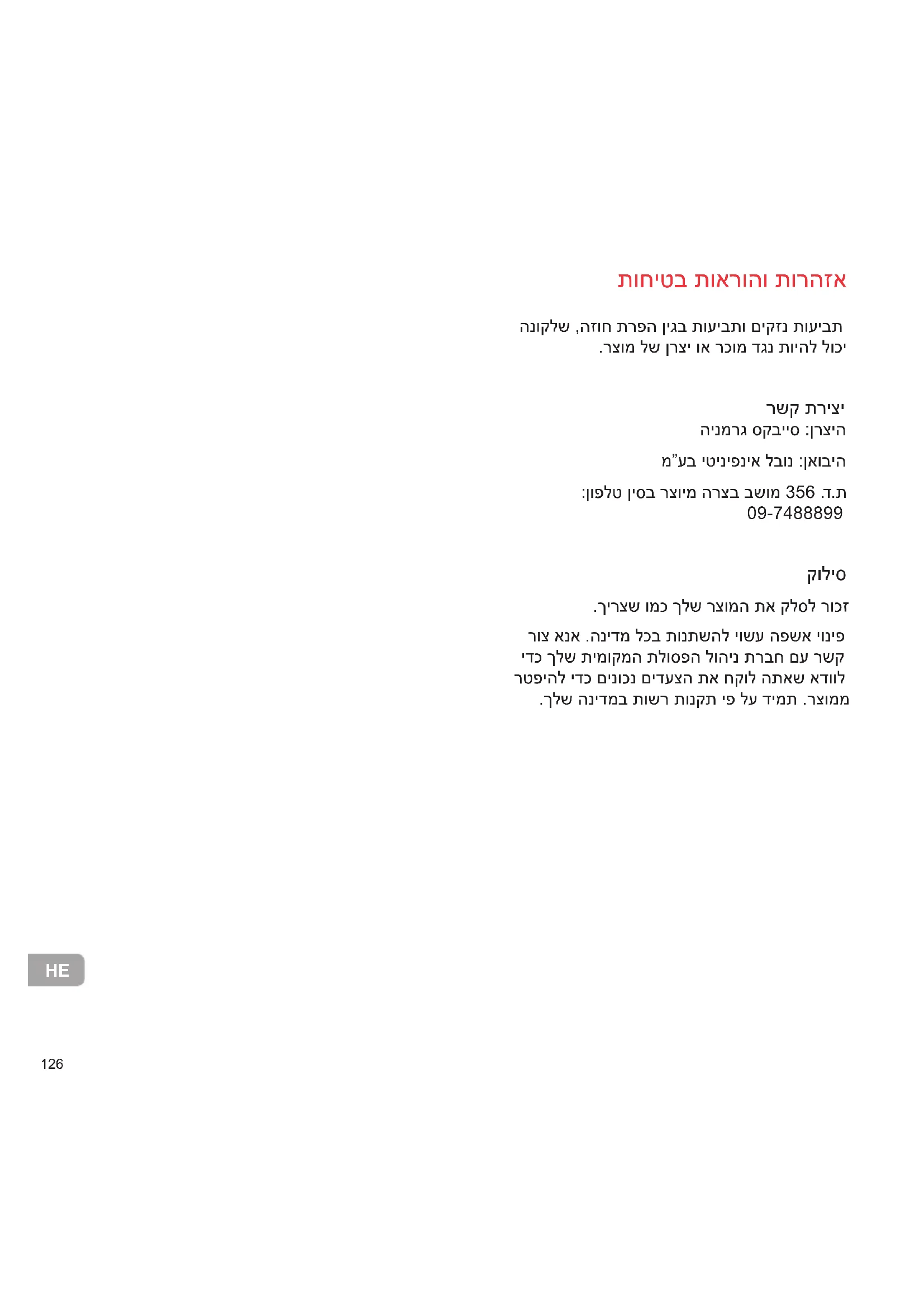 תוחיטב תוארוהו תורהזא תוענ תוגרדמ וא תוגרדמב תדרל וא תולעל ןיא םלועמ .םינפב דליה םע םע Q דואלק ןוטא וא CYBEX ןוטאב שומיש תעב M-Air3 / אגיס M-Air4 / Eternis M3 סיגא CYBEX ףילחת הווהמ וניא הז בכרמ ,pushchair / Eternis M4 שי זא ,ןושיל ךירצ ךלש דליהו הדימב .הטימ וא הסירעל .הטימה וא הביכש לסב ומקמל .בשומב דחא דלי לש ושומישל קרו ךא דעוימ הז רצומ םרגוליק 5.0 אוה לסל הפרוצש תרגסמל יברמה סמועה CYBEX אגיס M-Air3 / אגיס עובק ןפואב קודב ינמיס לכל M-Air4 / Eternis M3 / Eternis M4 תוארוהו הקוזחתל סחייתהו םימוגפ םיקלח וא הקיחש .ףדה 126‘ב יוקינ םע CYBEX לע ורשואש םירזבאב קר שמתשה M-Air3 / אגיס M-Air4 / Eternis M3 / סיגא CYBEX .Eternis M4 וא עורק ,רובש רצומה לש קלח לכ םא שמתשהל ןיא