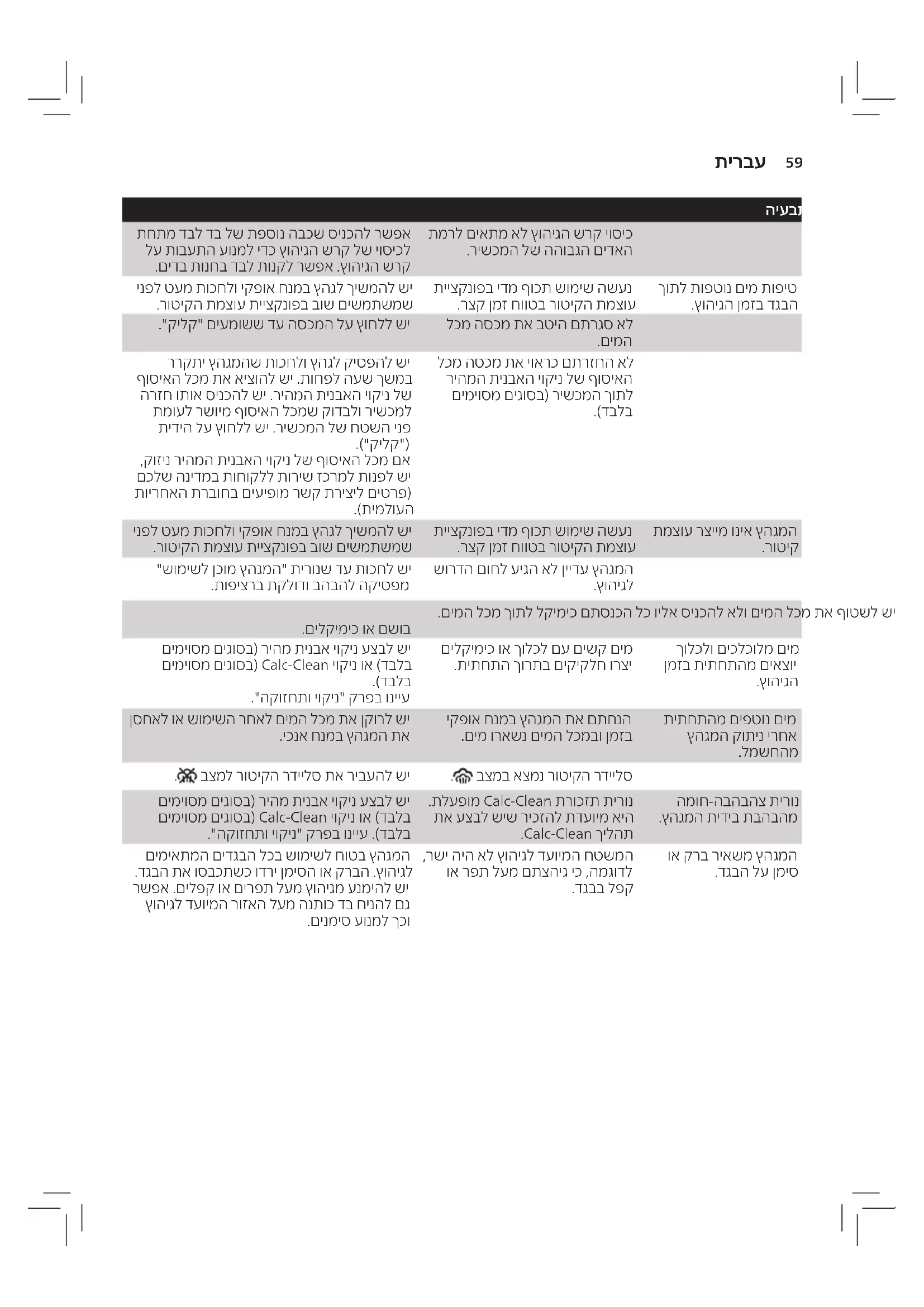 .םימה לכמ ךותל תינבא תרסהל םירחא םירמוח וא ץמוח ךופשל ןיא .)5-3 רויא( תוקד 2-כ ךרוא הז ךילהת .םמחתי ץהגמש תוכחל שי 3 . .םמחתמ רישכמהש ןמזב תיבכנ Calc-Clean תרוכזת תירונ :הרעה .)7-3 רויא( בהבהל הקיספמ "שומישל ןכומ ץהגמה" תירונשכ למשחהמ רישכמה תא קתנל שי 4 תא תולק םירענמו Calc-Clean ןצחל לע ץוחלל םיכישממ .רויכה לעמ ץהגמה תא םיקיזחמ 5 .)8-3 רויא( םילצונמ םימה לכמב םימה לכש דע הרוחאו המידק ץהגמה .תיתחתהמ םיאצוי םיחצור םימו םידא ,הצוחה תפטשנ תינבאה .תינבא יקיקלח םיליכמ ןיידע רישכמהמ םיאצויש םימה םא 5 דע 2 םיבלש לע רוזחל שי :הרעה 2-כ ךרוא הז ךילהת .תיתחתה תא שבייל ידכ םמחתיש םיכחמו למשחל רישכמה תא םירבחמ 6 .)9-3 רויא( תוקד ,דב תסיפ לעמ תונידעב רישכמה תא ריבעהל שי .)10-3 רויא( למשחהמ רישכמה תא םיקתנמ 7 .)11-3 רויא( תיתחתהמ םימ ימתכ ריסהל ידכ תויעב תריתפו רותיא רתויב תוצופנה תויעבה תא םכסמ הז קרפ www.philips.com/ רתאב ורקב ,ןלהלש עדימה תרזעב היעבה תא רותפל ןתינ אל םא .רישכמב שומישב .םכתנידמב תוחוקלה תוריש זכרמל ונפ וא ,תוצופנ תולאש לש המישר תלבקל support היעבתירשפא הביסןורתפ ריסהל חילצמ אל ץהגמה .דגבהמ םיטמק .ץוהיגה ןמזב םידא ןיא רדיילס תא ריבעהלו םימה לכמ תא אלמל שי . לא רוטיקה .םידא רציימ וניא ץהגמה.םימה לכמב םימ יד ןיא.םימה לכמ תא אלמל שי . בצמב אצמנ רוטיקה רדיילס. בצמל רוטיקה רדיילס תא ריבעהל שי רציימ אל ןכלו קיפסמ םח אל ץהגמה