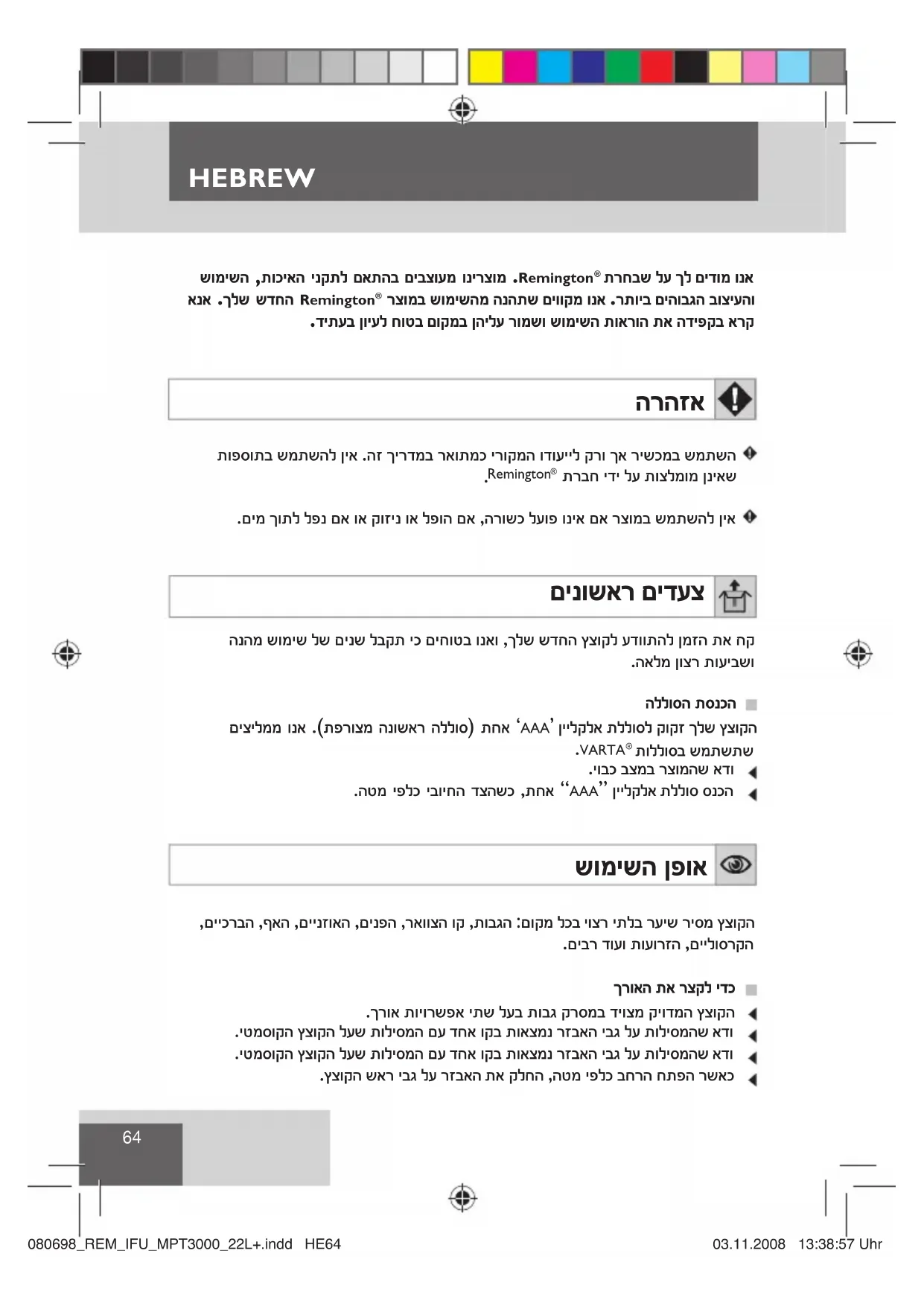 םהל תתל םנוחטיבל םיארחאה לע .םינכוסמ םיבצמל ליבוהל לולע עדיו ןויסינ ירסח םישנא .רישכמב שומישה ןמזב םהילע חיגשהל וא תושרופמ תויחנה הביבסה לע הנגה .ולש תורישה ייח םותב יתיב הפשא חפל הז רצומ ךילשהל ןיא .ןיילקלא תללוס לע לעופ רצומה .םימיאתמ ףוסיא ירתאב תושעיהל הלוכי רצומה תכלשה טולפלו ץצופתהל תולולע ןהש ןוויכמ תוללוסה זראמ תא תיחשהל וא ףורשל ןיא :הרהזא .םיליער םירמוח www.remington-europe.com - האר רוזחימ לע ףסונ עדימל 080698_REM_IFU_MPT3000_22L+.indd HE65080698_REM_IFU_MPT3000_22L+.indd HE65 03.11.2008 13:38:57 Uhr03.11.2008 13:38:57 UhrHEBREW