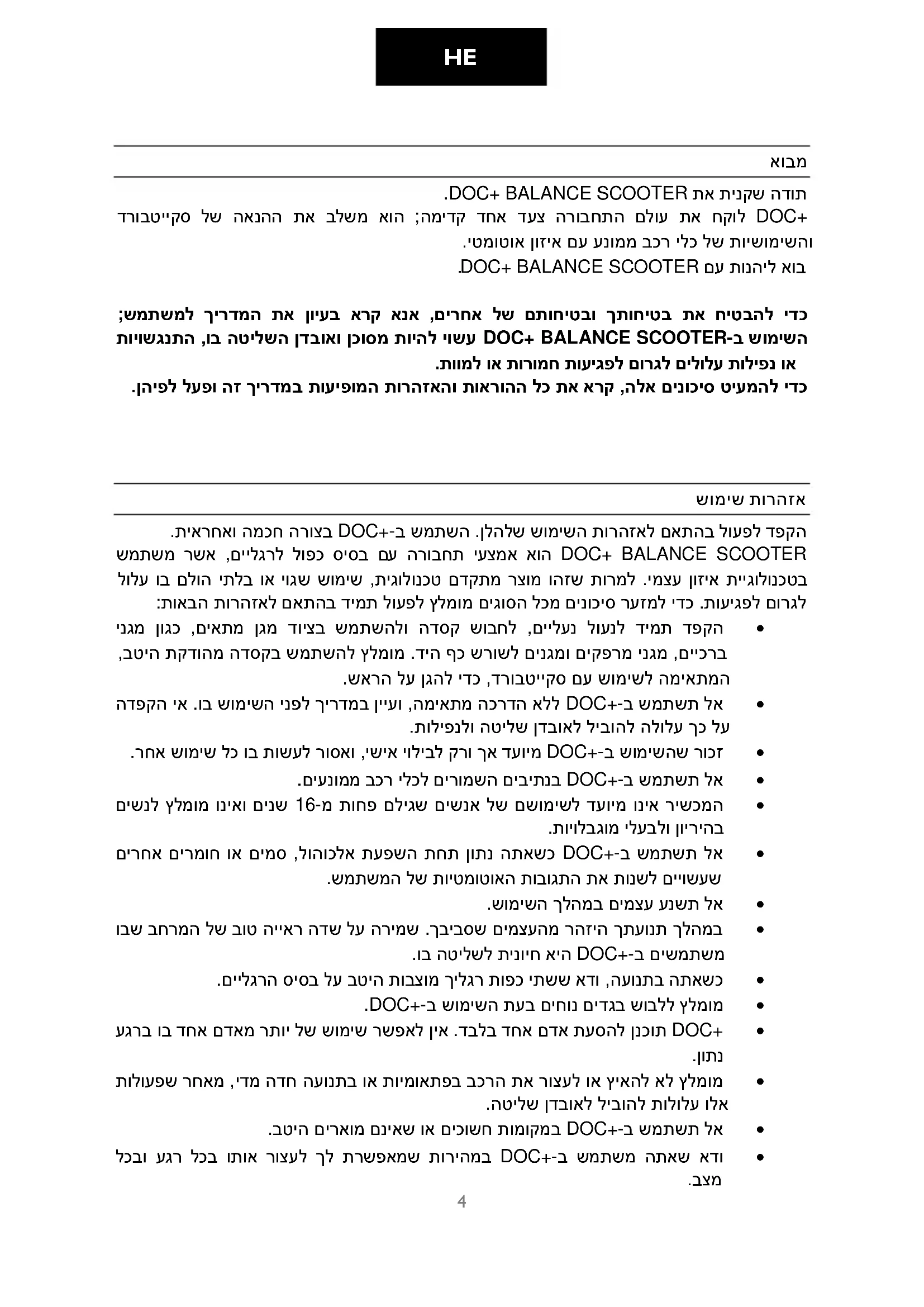 - .םיממוחמ םניאש הינחב וא ןסחמב ןסחאת לא ה תא תונשל וא ןקתל ןויסינ לכ-DOC+ BALANCE SCOOTER לוטיבל וליבוי ,וב הלבח לכו , .תוירחאה לש יטמוטוא