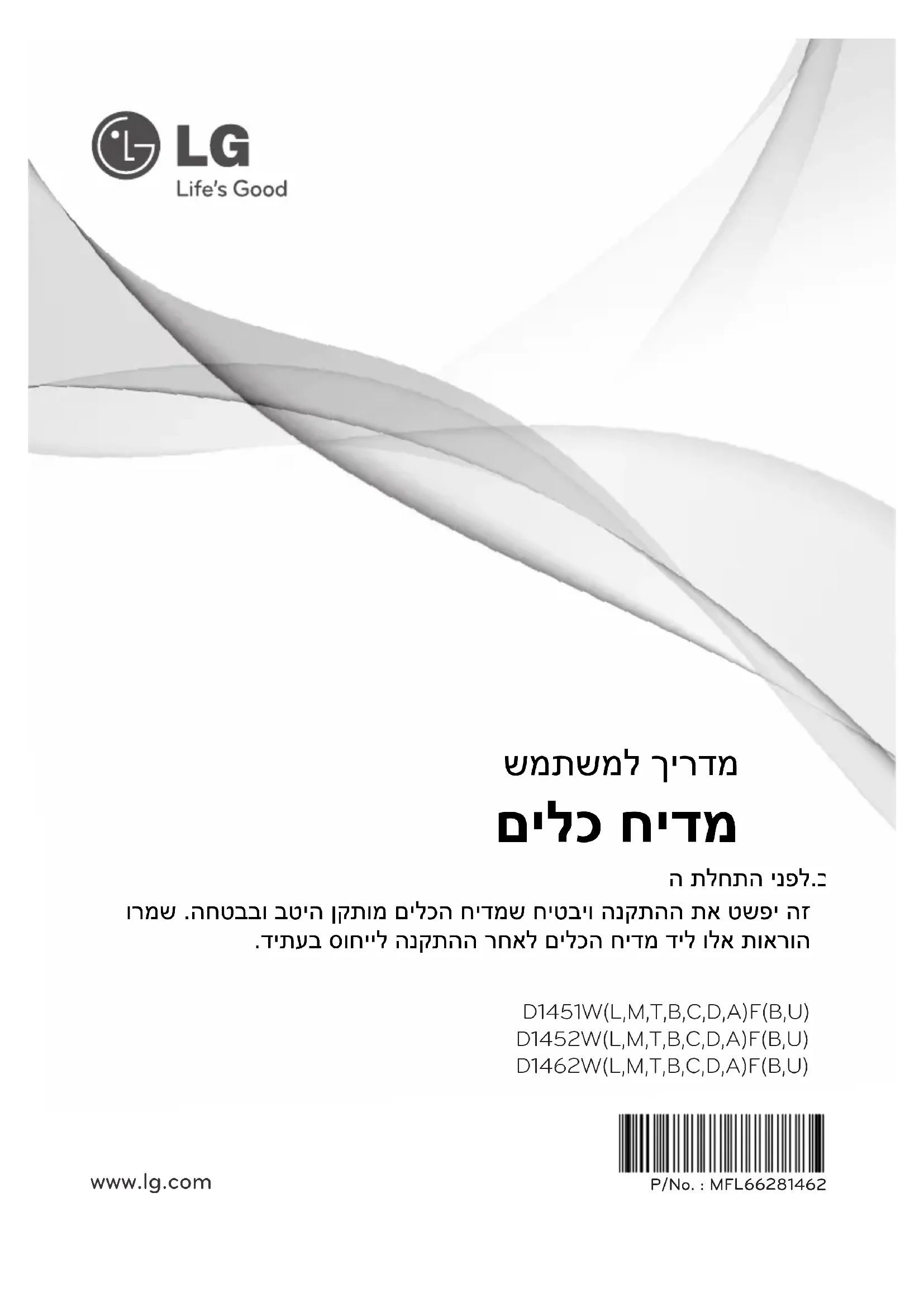 ה תלחתה ינפל.בל תמושתב ולא תוארוה וארק ,הנקתה ורמש .החטבבו בטיה ןקתומ םילכה חידמש חיטביו הנקתהה תא טשפי הז .דיתעב סוחייל הנקתהה רחאל םילכה חידמ דיל ולא תוארוה D1451W(L,M,T,B,C,D,A)F(B,U) D1452W(L,M,T,B,C,D,A)F(B,U) D1462W(L,M,T,B,C,D,A)F(B,U) P/No. : MFL66281462 www.lg.com2 םידבכנ תוחוקל א תרבח .יבסאטעב וינבו ינ"מ םתשכרש לע םכל הדומ מםילכ חידז יתוכיא ה תרצותמ