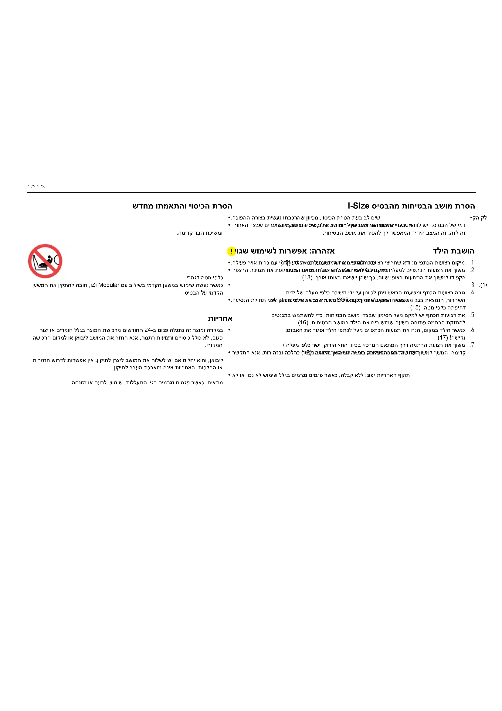 1 .)2( .םיקורי ,סיסבה לעש ,הפצרה ךמות לש םינווחמהו ISOxלש םינמסהש אדוול שי 2 . ךירדמב תראותמ ימדקה ןעשמה תלועפ .סיסבה לע ןקתומ ימדקה ןעשמהש אדוול שי )2( .סיסבב שמתשמל 3 . בשומהש אדוול שי ,ונממ ותוא ריסהל וא סיסבה לע תוחיטבה בשומ תא ןיקתהל םיצור םא תויהל םיבייח סיסבה לעו בשומה לעש םיבוהצה םיצחה ינש .ררחושמ בצמב אצמנ בלש האר – היטהה תידיב שמתשהל שי ,היטהה בצמ תא ןנווכל ידכ .הזל הז םירשוימ )3( .6 4 . ןווחמהו סיסבה לע השיקנב לעננ אוה רשאכ סיסבה לע ןוכנה םוקמב םקוממ בשומה )3( .קורי עבצב ימדקה 5 . ףוחדל שי ,בכרה לש ירוחאה בשומב רוחאל םינפה םע תוחיטבה בשומ תא ןיקתהל ידכ בשומ ןיבל וניב עגמ רצווייש ךכ ,רשפא םא ,תינרוחא בכרה לש ימדקה בשומה תא תא ףוחדל שי ,בכרה בשומ ןיבל תוחיטבה בשומ ןיב עגמ רוציל ןתינ אל םא )4( .תוחיטבה .רשפאש המכ דע המידק בכרה לש ימדקה בשומה לש בגה תנעשמ 6 . תא ריסהל ןתינ ,סיסבה לש ימדקה קלחב תאצמנה ,בשומה רורחש תידיב הכישמ ידי לע לעו בשומה לעש םיבוהצה םיצחה ינשש אדוול שי )5,6( .ותוא בבוסלו תוחיטבה בשומ .תוחיטבה בשומ תא ריסהל ךל רשפאמה דיחיה בצמה הז ;הזל הז םירשוימ בשומה סיסב 7 . מ”ס 88 דליה לש והבוג רשאכ קר םינפל הנפיש ידכ תוחיטבה בשומ תא בבוסל רתומ ,ירשפא רבדה דוע לכ ,הצילממ BeSafe .םישדוח 15 מ הלעמל וליג רשאכ וא תוחפל .רוחאל הנופ אוהשכ תוחיטבה בשומב שמתשהל 8 .)7( .1 בצמב תויהל בייח ימדקה ןעשמה ,םינפל םינפה םע םקוממ בשומה רשאכ 9 . הז בשומ .תוחיטבה בשומ תא בבוסל ןתינ אל BeSafe לש iZi Modular RF םגדב .דבלב רוחאל םינפה םע שומישל דעוימ 10 . לש ימדקה קלחב תאצמנה ,היטהה תידיב הכישמ ידי לע תוחיטבה בשומ תא תוטהל ןתינ )8( .בשומה 11 . םיבצמה ינשב קר וב שמתשהל רשפא ,רוחאל הנופה בצמב ןקתומ תוחיטבה בשומשכ )9( .רתויב הלודגה היטהה תיווז תא םירצויה 12 . ידי לע םיילגרל םוקמה תא לידגהל ןתינ ,רוחאל הנופה בצמב ןקתומ תוחיטבה בשומשכ ןנווכל ידכ .םיבצמ 3 ימדקה ןעשמה תספוקל .סיסבהמ ימדקה ןעשמה תספוק לש התאצוה סיסבה תא ררחשלו סיסבהמ תוחיטבה בשומ תא ריסהל שי ,ימדקה ןעשמה בצמ תא )10( . isox-המ 13 . הנגה ףסותב שמתשהל שי .הרסהל ןתינש )דצ תונגה ףסות( SIP+ םע עיגמ בשומה תורייואמה תוארוהה רחא בוקע SIP+ ה תא רבחל ידכ .בכרה תלדל בורק רשא דצב הז .ההובג המרב תינבומ הנגה עיצמ רבכ הז תוחיטב בשומ .תוחיטבה בשומ םע ךל וקפוסש )11( .רתוי ףא דצ תועיגפמ הנגהה תא רפשמ הז דצ תנגה ףסות 14 . אוה בכרה תלדל אסיכה ןיב חוורמה רשאכ דצ תועיגפ ינפמ הנגהה תירכב שמתשת לא .ומצע בכרה בשומ לע ןוכנ םקוממ יוניא אסיכהשבצמל םורגל לולעו ידימ ןטק הנקתה ינפל הנכה i-Size סיסבה לע תוחיטבה בשומ תנקתה