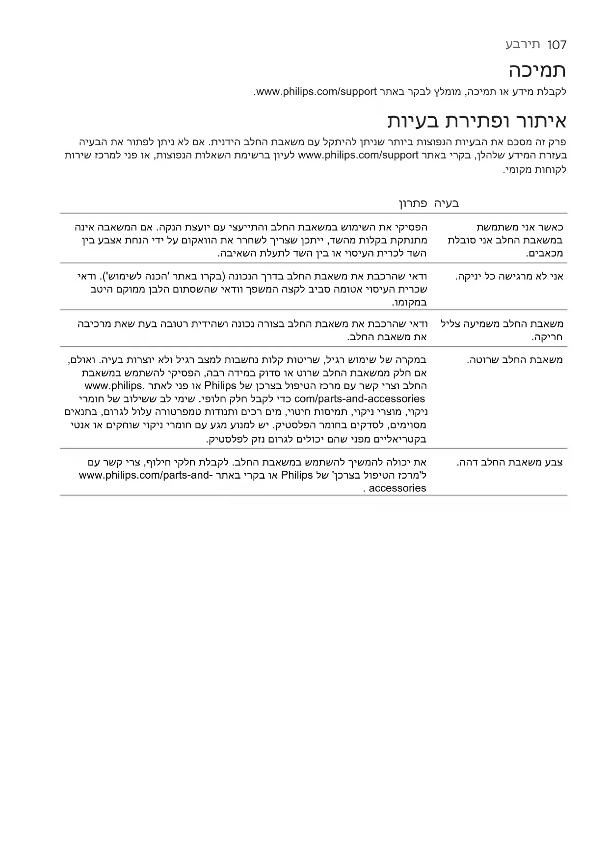 .www.philips.com/support רתאב רקבל ץלמומ ,הכימת וא עדימ תלבקל תויעב תריתפו רותיא היעבה תא רותפל ןתינ אל םא .תינדיה בלחה תבאשמ םע לקתיהל ןתינש רתויב תוצופנה תויעבה תא םכסמ הז קרפ תוריש זכרמל ינפ וא ,תוצופנה תולאשה תמישרב ןויעל www.philips.com/support רתאב ירקב ,ןלהלש עדימה תרזעב .ימוקמ תוחוקל