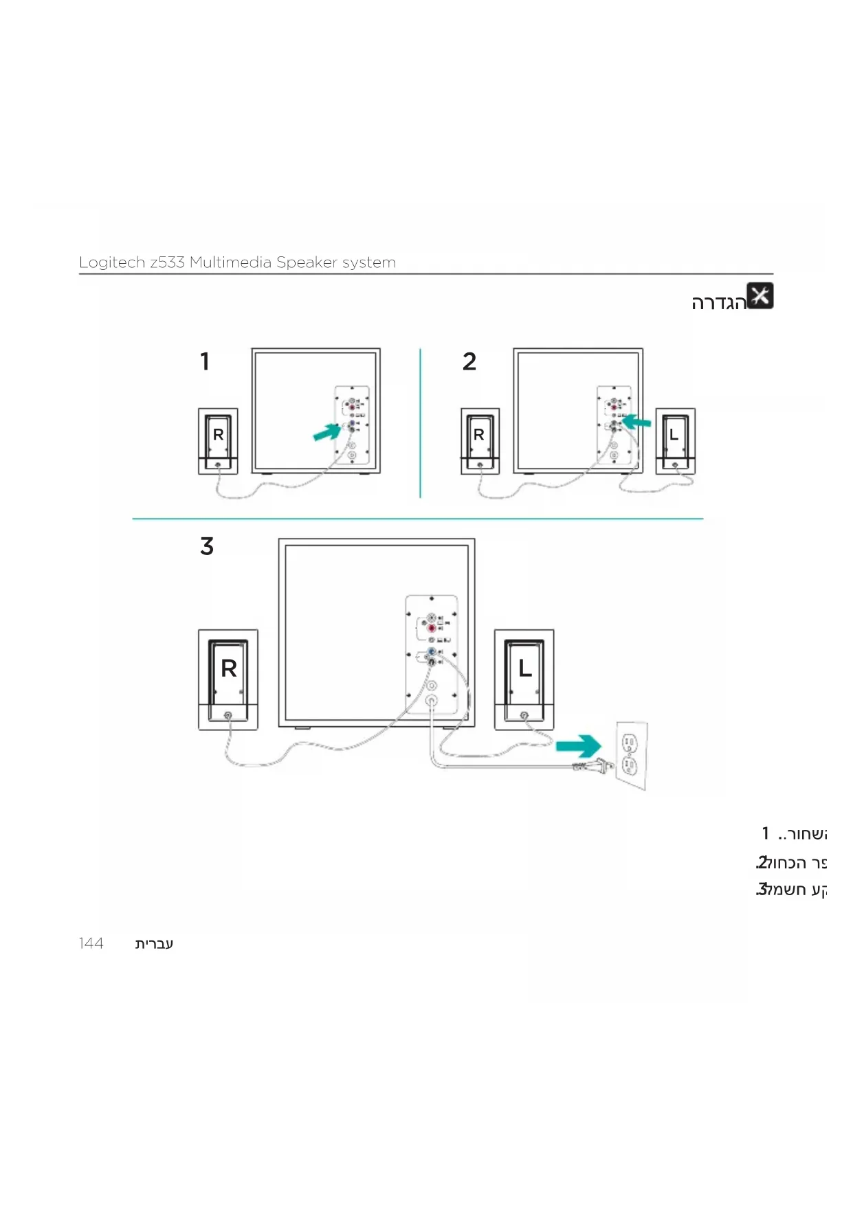 תוינזואב שומיש ינמיה ודצבש תוינזואה עקש ל רבחתהל תולוכי מ"מ 3.5 רבחמב תודיוצמה תויגולנאה תוינזואה יגוס בור .יטוחה טלשה לש סאבה תמצוע ןוויכ BASS סאבה גתמ תא טסה ,Multimedia Speaker System z533תכרעמ לש סאבה תמר תא ןווכל ידכ יטוחה טלשה לש ילאמשה ודצב םקוממה סאבה תמר תרבגהל ןועשה ןוויכ םע גתמה תא זזה - .סאבה תמר תכמנהל ןועשה ןוויכ דגנ גתמה תא זזה - סאבwww logitech com/support/z533 © 2015 Logitech. All rights reserved. Logitech, the Logitech logo, and other Logitech marks are owned by Logitech andmay be registered. Registered in the U.S. andother countries. All other trademarks are theproperty of theirrespective owners. Logitech assumes no responsibility for any errors that may appear in this manual. Informationcontained herein is subject to change without notice. 621-000608.002
