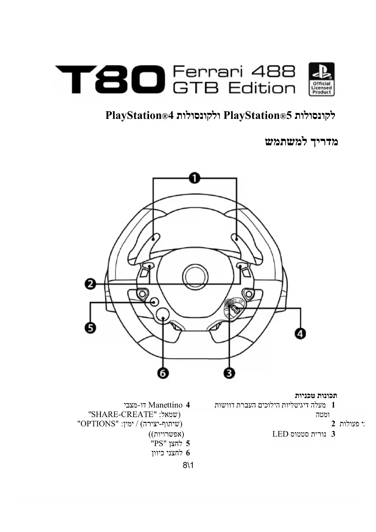 תלוסנוקל עגונב הבושח הרעהPS5™ תלוסנוק ואPS4™ " ןצחלה לע ץוחלל רוכזל בושחPS ")5( .הגהב שמתשהל היהי רשפאש ידכ8\5 תלוסנוקב תיטמוטוא הגה תיימדהPS5™ נוקב ואתלוס PS4™ הלוסנוקל םיקחשמב PlayStation®5 הלוסנוקלו PlayStation®4ה ,-T80 Racing Wheel ה ה ו ז מ .רפושמ קוידו רתוי הבוט תונעיה לבקל ידכ ,רקבכ אלו יתימא הגהכ