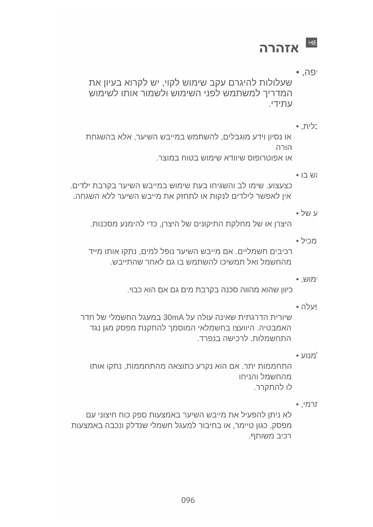 - הלעפה םע (RCD) ירויש םרז ןקתה ןיקתהל ץלמומ ,תפסונ הנגהל רדח לש ילמשחה לגעמב 30mA לע הלוע הניאש תיתגרדה תירויש דגנ ןגמ קספמ תנקתהל ךמסומה יאלמשחב וצעוויה .היטבמאה .דרפנב השיכרל .תולמשחתה