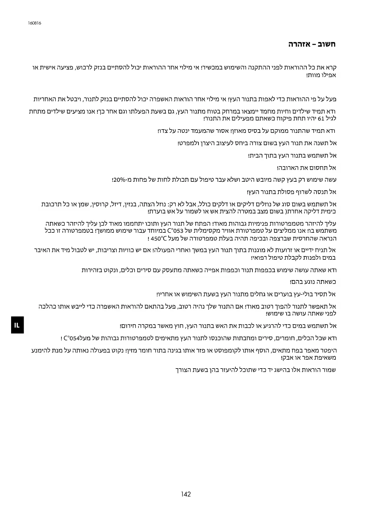 הרהזא – בושח וא תישיא העיצפ ,שוכרל קזנב םייתסהל לוכי תוארוהה רחא יולימ יא !רישכמב שומישהו הנקתהה ינפל תוארוהה לכ תא ארק !תוומ וליפא תוירחאה תא לטביו ,רונתל קזנב םייתסהל לוכי הרפשאה תוארוה רחא יולימ יא !ץעה רונתב תופאל ידכ תוארוהה יפ לע לעפ תחתמ םידליש םיעיצמ ונא !ךכ רחא םגו ותלעפה תעשב םג ,ץעה רונתמ חוטב קחרמב ואצמיי דמחמ תויחו םידליש דימת אדו !רונתה תא םיליעפמ םתאשכ חוקיפ תחת ויהי 61 ליגל !ודצ לע הטני דמעמהש רוסא !ןזואמ סיסב לע םקוממ רונתהש דימת אדו !טרפמלו ןרציה בוציעל סחיב הרוצ םושב ץעה רונת תא הנשת לא !תיבה ךותב ץעה רונתב שמתשת לא !הבוראה תא םוסחת לא !20%-מ תוחפ לש תוחל תלוכת םע לופיט רבע אלשו בטיה שבוימ השק ץעב קר שומיש השע !ץעה רונתב תלוספ ףורשל הסנת לא תבוכרת לכ וא ןמש ,ןיסורק ,לזיד ,ןיזנב ,התצה לזונ :קר אל לבא ,ללוכ םיקלד וא םיקילד םילזונ לש גוס םושב שמתשת לא !תרעוב שא לע רומשל וא שא תיצהל הרטמב בצמ םושב )תרחא הקילד תימיכ התאשכ רהזיהל ךילע ןכל דואמ וממחתי וכותו ץעה רונת לש חתפה !דואמ תוהובג תוימינפ תורוטרפמטמ רהזיהל ךילע לככ וז הרוטרפמטב !ךשוממ שומיש רובע דחוימב C°053 לש תילמיסקמ ריווא תרוטרפמט לע םיצילממ ונא !וב שמתשמ !450°C לעמ לש הרוטרפמט תלעב היהת הפיכבו הפצרבש תיסרחהש הארנה רביאה תא דימ לובטל שי ,תובירצו תויווכ שי םא !הלועפה ירחאו ךשמב ץעה רונת ךותב תונגומ אל תועורז וא םיידי חינת לא !יאופר לופיט תלבקל תונפלו םימב תוריהזב טוקנו ,םילכו םיריס םע קסעתמ התאשכ הייפא תופפכו רונת תופפכב שומיש השוע התאש אדו !םהב עגונ התאשכ !וירחא וא שומישה תעשב ץעה רונתמ םילחג וא םירעוב ץע-ילוב ריסת לא הכלהכ ותוא שבייל ידכ הרפשאה תוארוהל םאתהב לעפ ,בוטר היהנ ךלש רונתה םא !דואמ בוטר ךופהל רונתל רשפאת לא !שומיש וב השוע התאש ינפל !םוריח הרקמב רשאמ ץוח ,ץעה רונתב שאה תא תובכל וא עיגרהל ידכ םימב שמתשת לא ! C°054לעמ לש תוהובג תורוטרפמטל םימיאתמ ץעה רונתל וסנכוהש תותבחמו םיריס ,םירמוח ,םילכה לכש אדו ענמיהל תנמ לע התואנ הלועפב טוקנ !ןיזמ רמוח רותב הניגב ותוא רזפ וא טסופמוקל ותוא ףסוה ,םיאתמ חפב רפאמ רטפיה !קבא וא רפא תפיאשמ ךרוצה תעשב ןהב רזעיהל לכותש ידכ די גשיהב ולא תוארוה רומש