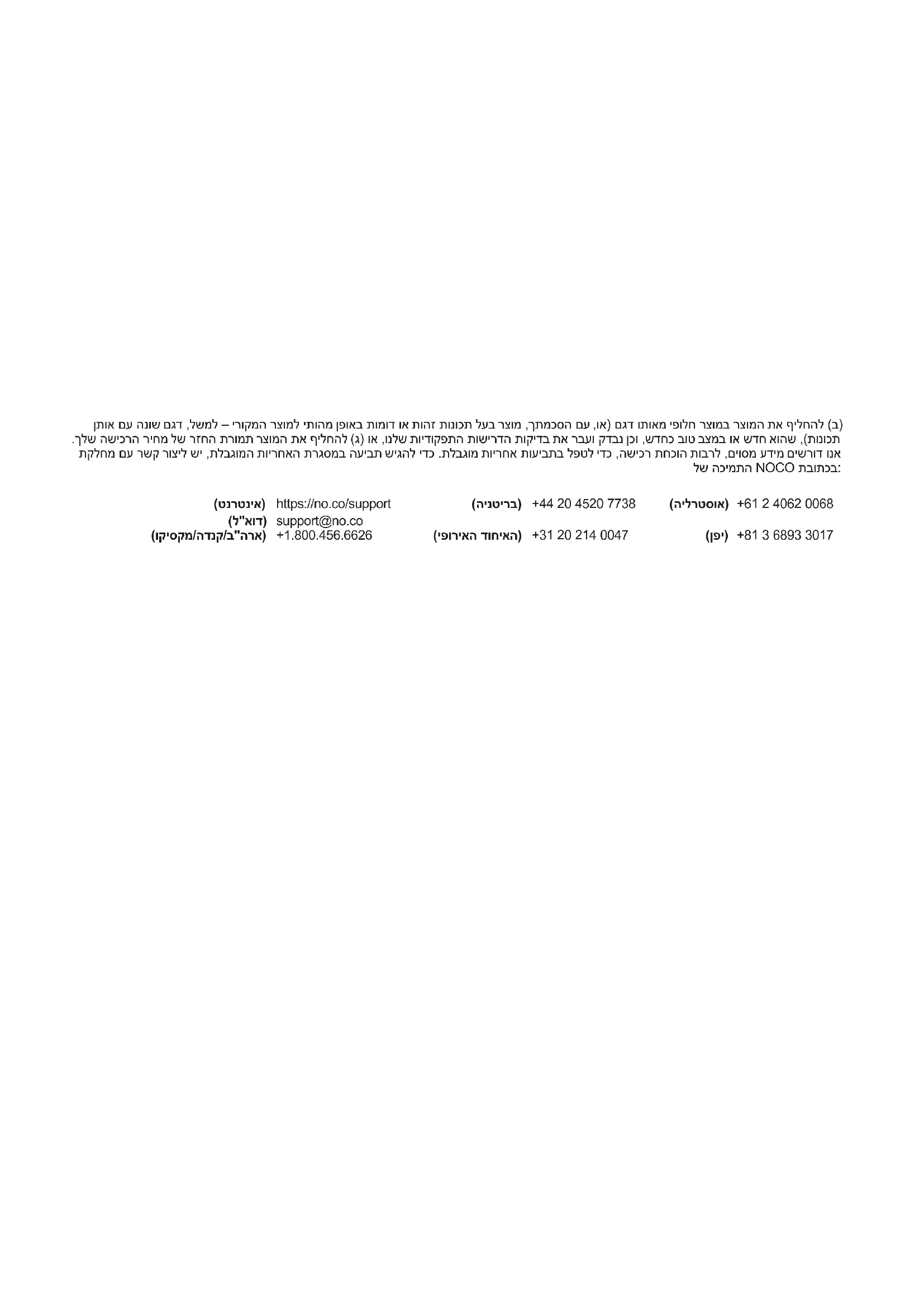 (US/CA/MX) https://no.co/support support@no.co +1.800.456.6626 (UK) (EU) (AU) (JP) +44 20 4520 7738 +31 20 214 0047 +61 2 4062 0068 +81 3 6893 3017ןתוא םע הנוש םגד ,לשמל – ירוקמה רצומל יתוהמ ןפואב תומוד וא תוהז תונוכת לעב רצומ ,ךתמכסה םע ,וא( םגד ותואמ יפולח רצומב רצומה תא ףילחהל )ב( .ךלש השיכרה ריחמ לש רזחה תרומת רצומה תא ףילחהל )ג( וא ,ונלש תוידוקפתה תושירדה תוקידב תא רבעו קדבנ ןכו ,שדחכ בוט בצמב וא שדח אוהש ,)תונוכת תקלחמ םע רשק רוציל שי ,תלבגומה תוירחאה תרגסמב העיבת שיגהל ידכ .תלבגומ תוירחא תועיבתב לפטל ידכ ,השיכר תחכוה תוברל ,םיוסמ עדימ םישרוד ונא לש הכימתה NOCO תבותכב: