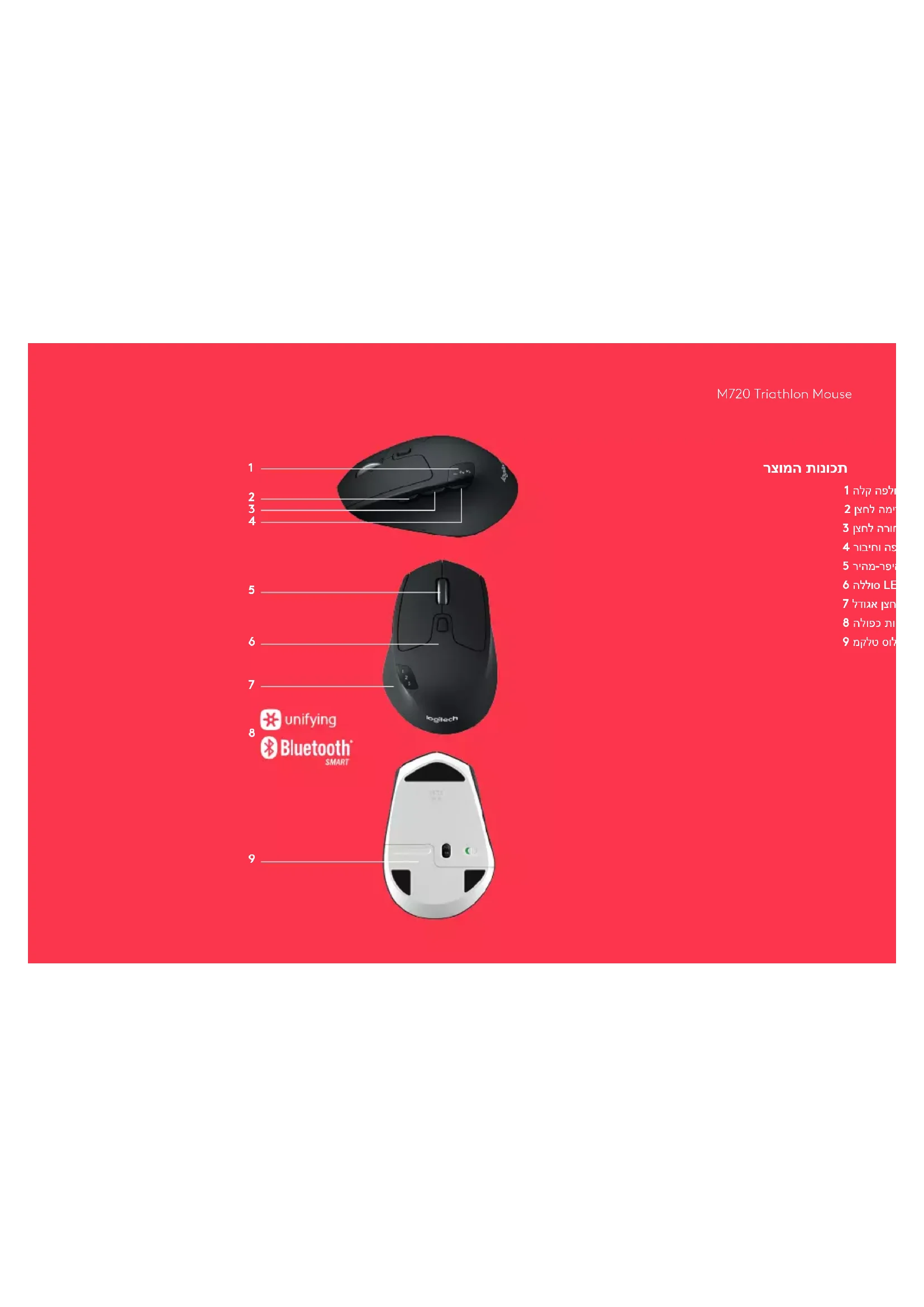 רצומה תונוכת 1 הלק הפלחה 2 ןצחל המידק 3 ןצחל הרוחא 4 רוביחו הפלחה ןצחל 5 ריהמ-רפיה הלילג הגה 6 הללוס LED תירונ 7 לדוגא ןצחל 8 הלופכ תוירושיק 9 מקלט סוללה ואחסון מקלטM720 Triathlon Mouse www.logitech.com/downloads Logitech